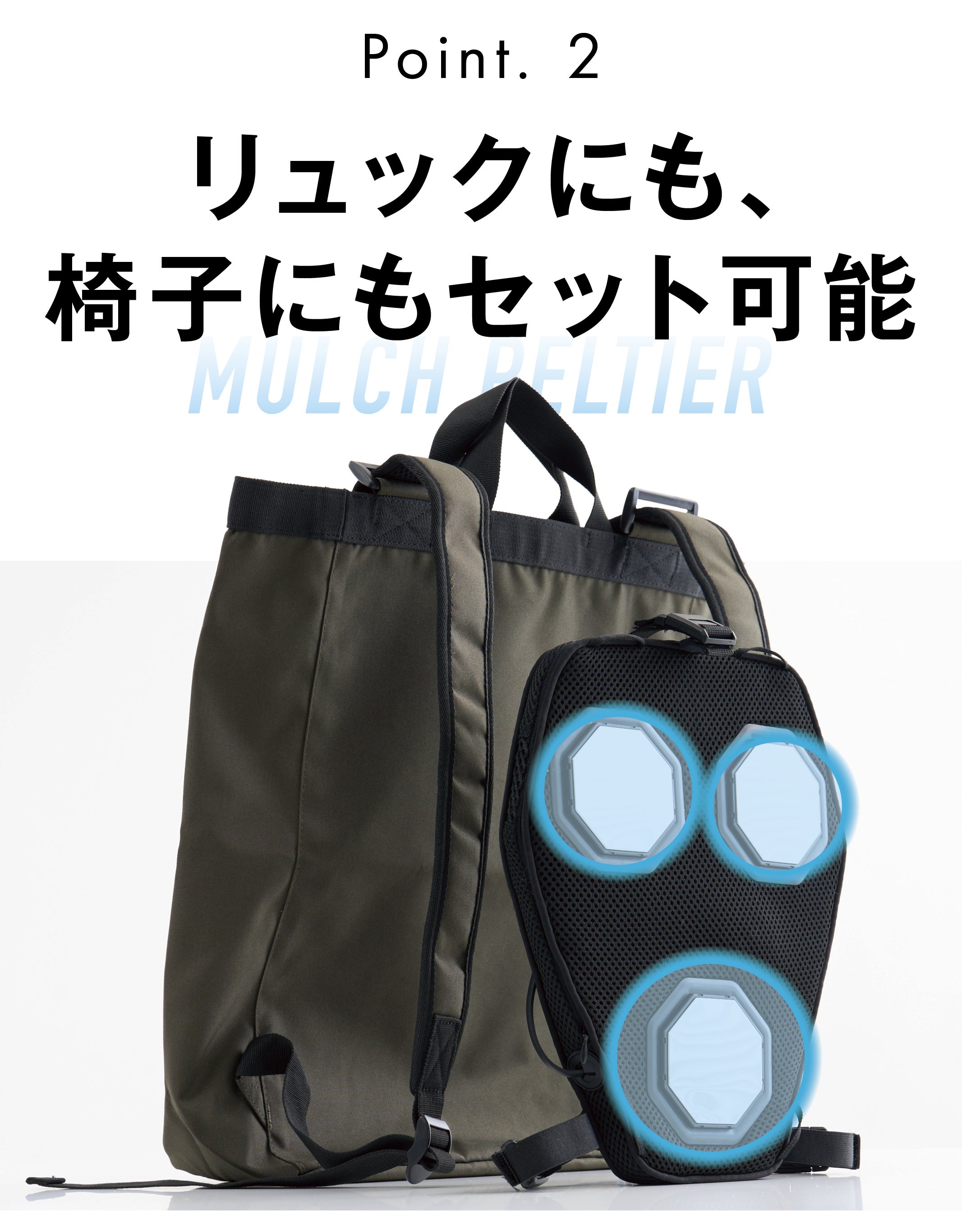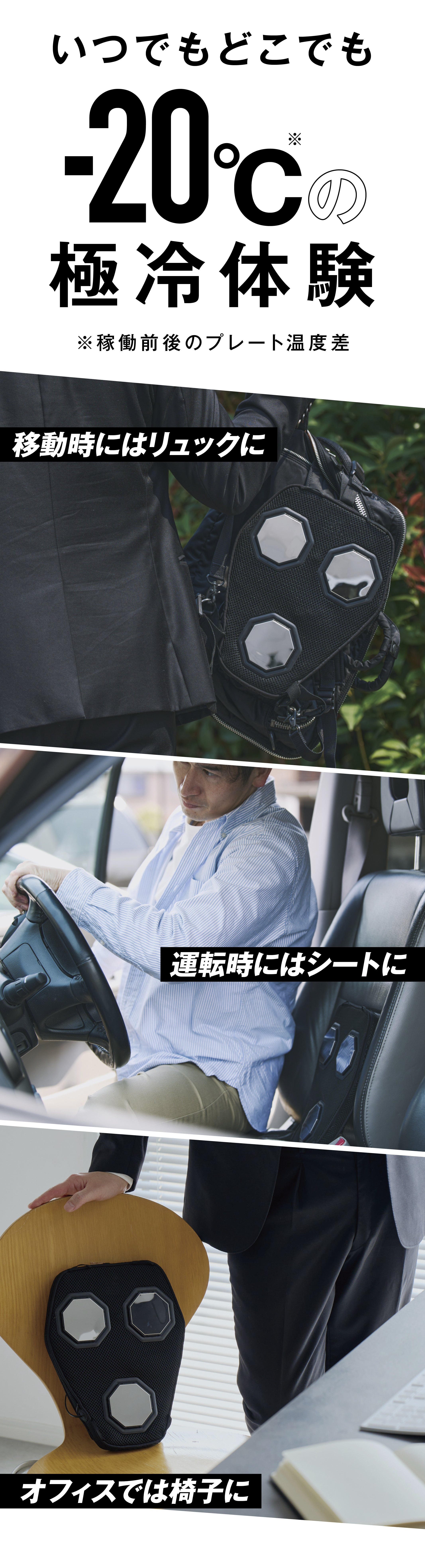 リュックに装着することで、グラフェン搭載の新型ペルチェプレートがあなたを背中から-20度の瞬間冷却。