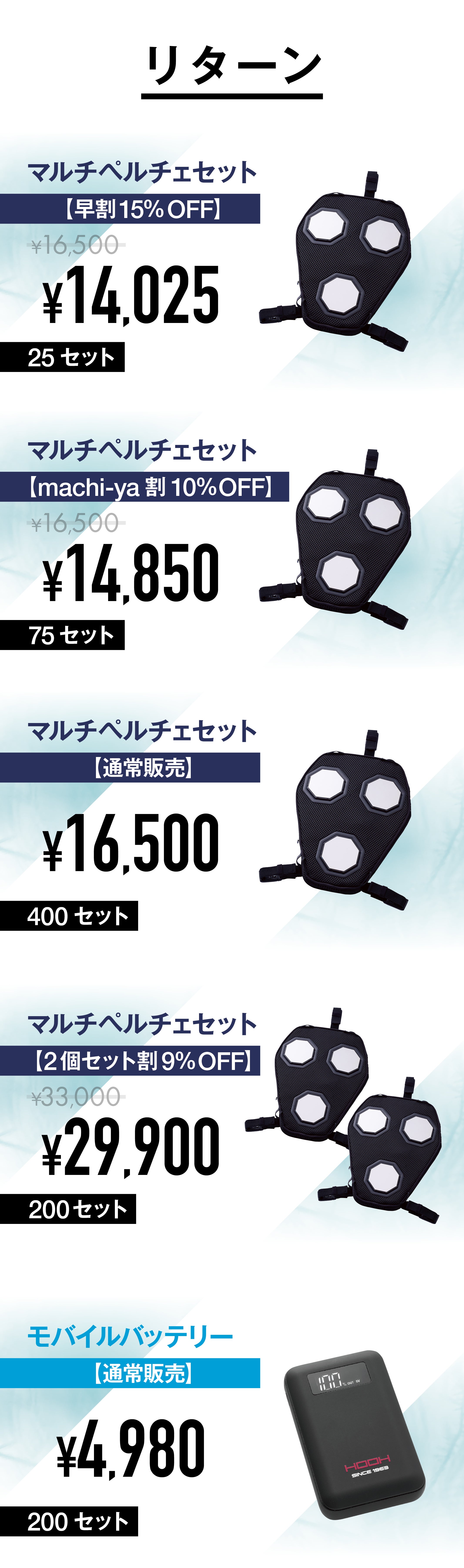 ペルチェデバイス3個×1セット(※3個で1セットとなっており、分離不可になります。)、モバイルバッテリー×1、充電用USBケーブル×1、専用スイッチ、リュックベルト×3、バックル付ベルト×1、取扱説明書/保証書×1