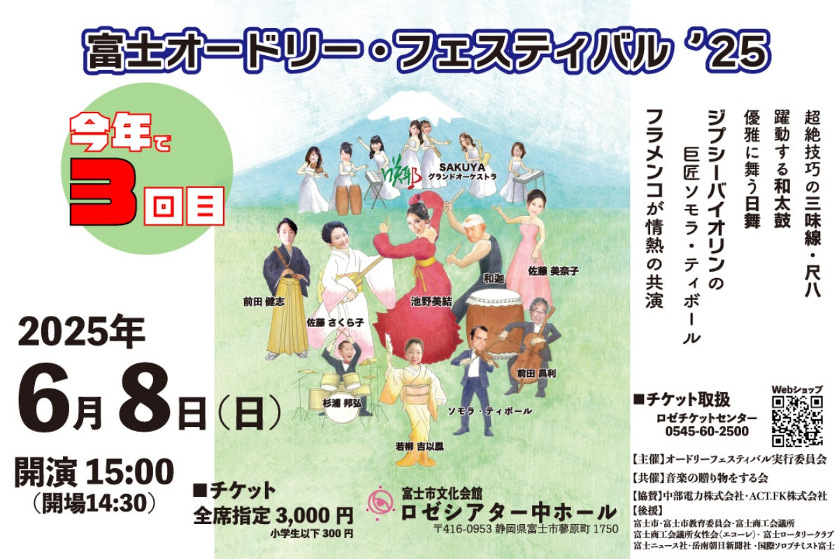 2025/04/29 13:00いよいよ、ここからが「富士オードリーフェスティバル」でしか観られないものが続きます。こちらは、誰もが聞いたことがある「剣の舞」という楽曲。演奏では、SAKUYAグランドオーケストラの演奏に佐藤さくら子さんの三味線がコラボ!その上、ダンスの融合です!これぞ富士オードリーフェスティバル!今年はどんなコラボレーションが披露されるか楽しみです!! もっと見る