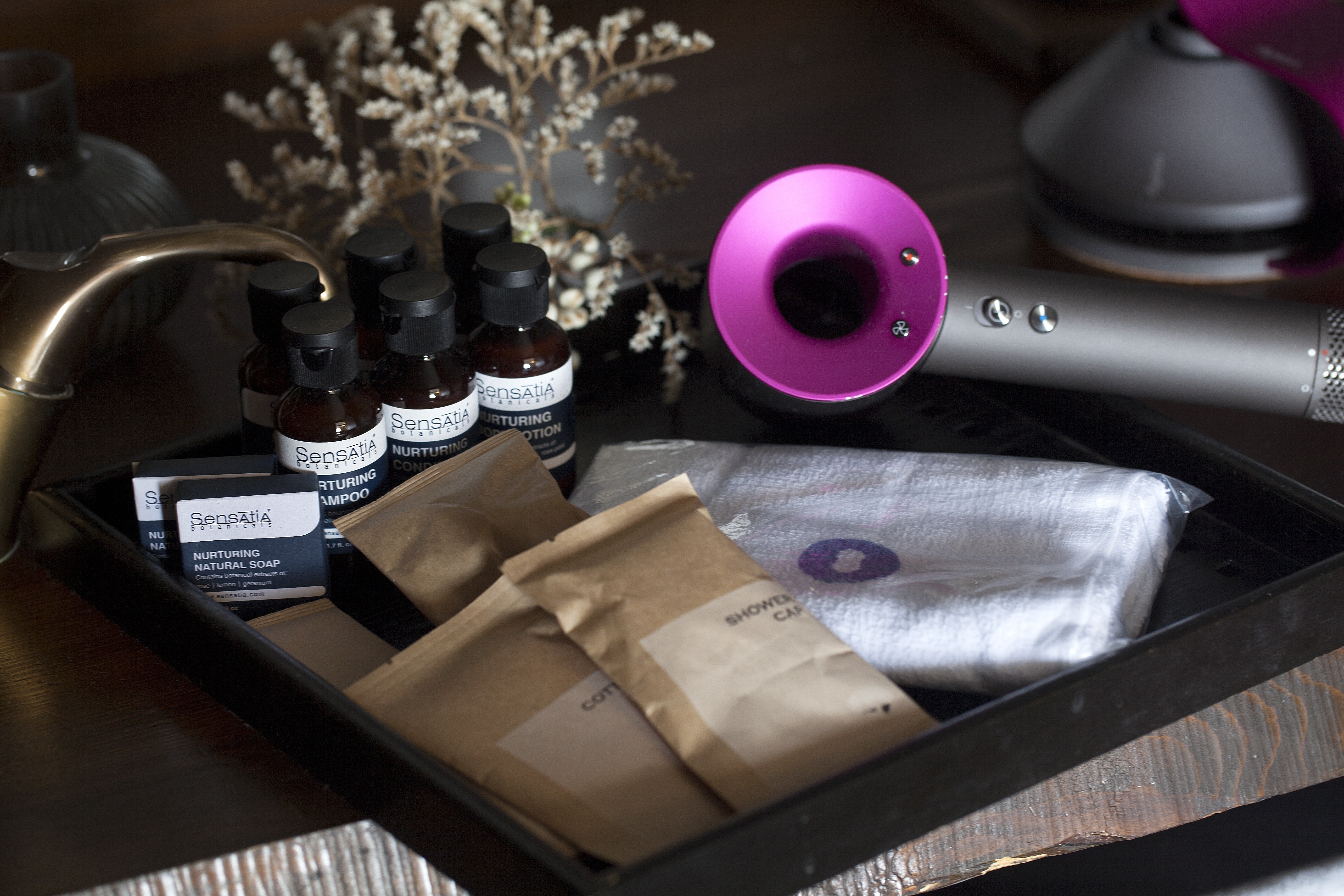 アメニティにも細やかな心配りを。シャワーヘッドにはミラブル社製、ドライヤーにはダイソン社製を採用するなど、上質な滞在を支えるための設備を採用しています。