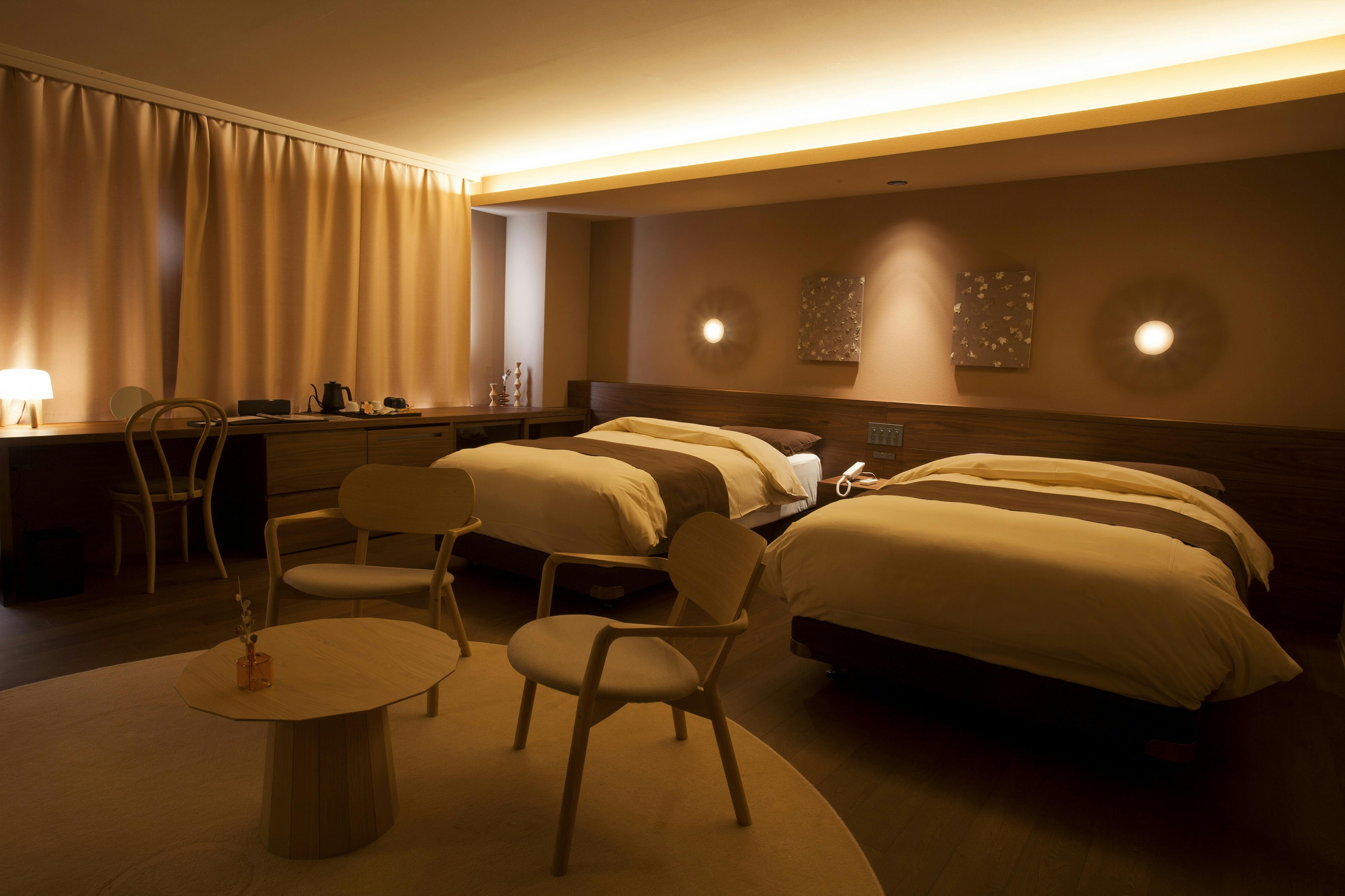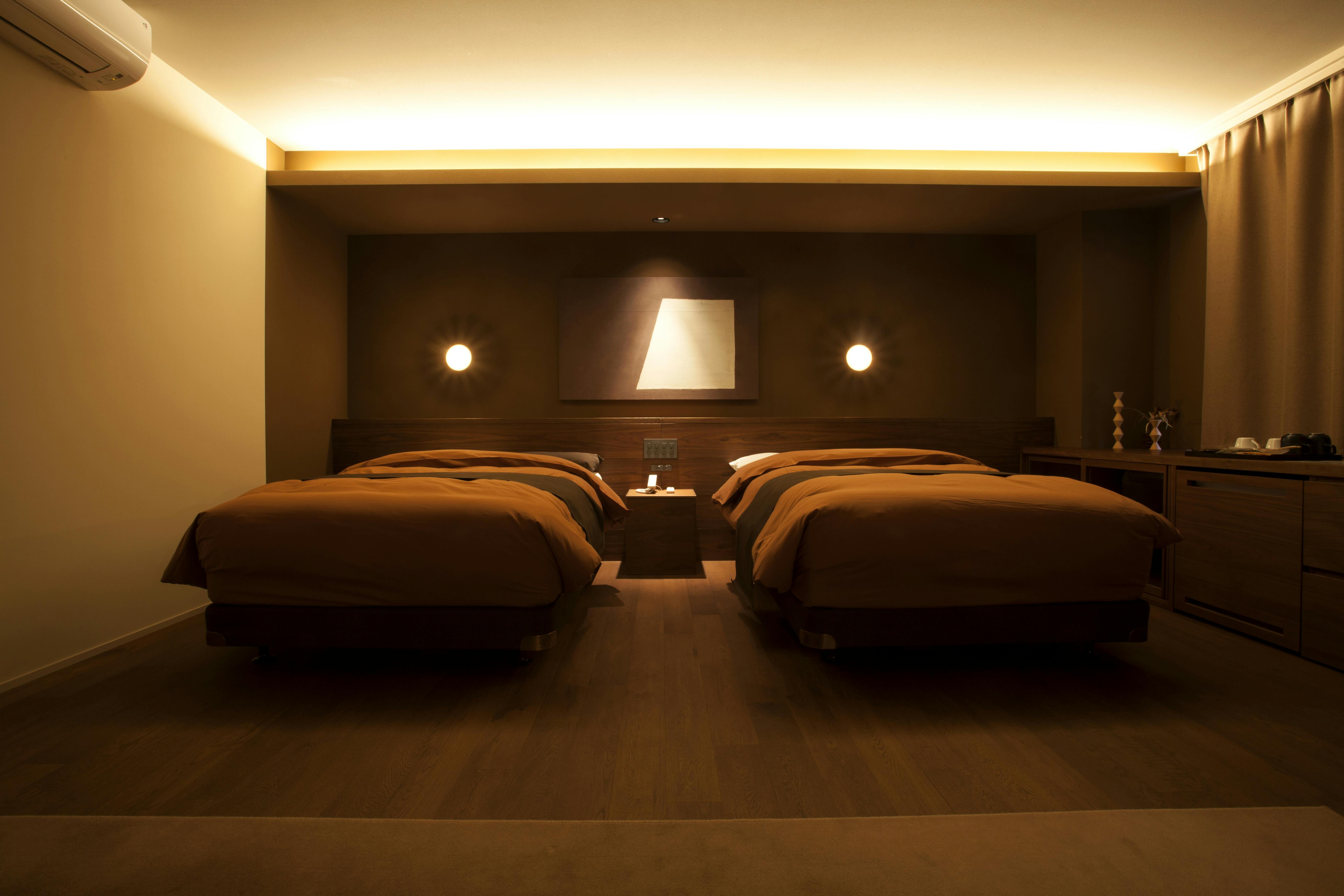 ベッドは、世界の一流ホテルでも使用されるSealy社・Simmons社のものを取り入れ、身体をやさしく包み込む寝心地を追求しました。照明や導線の設計にも静けさと落ち着きを意識し、一晩の滞在で心までほどけるような空間を丁寧に整えています。