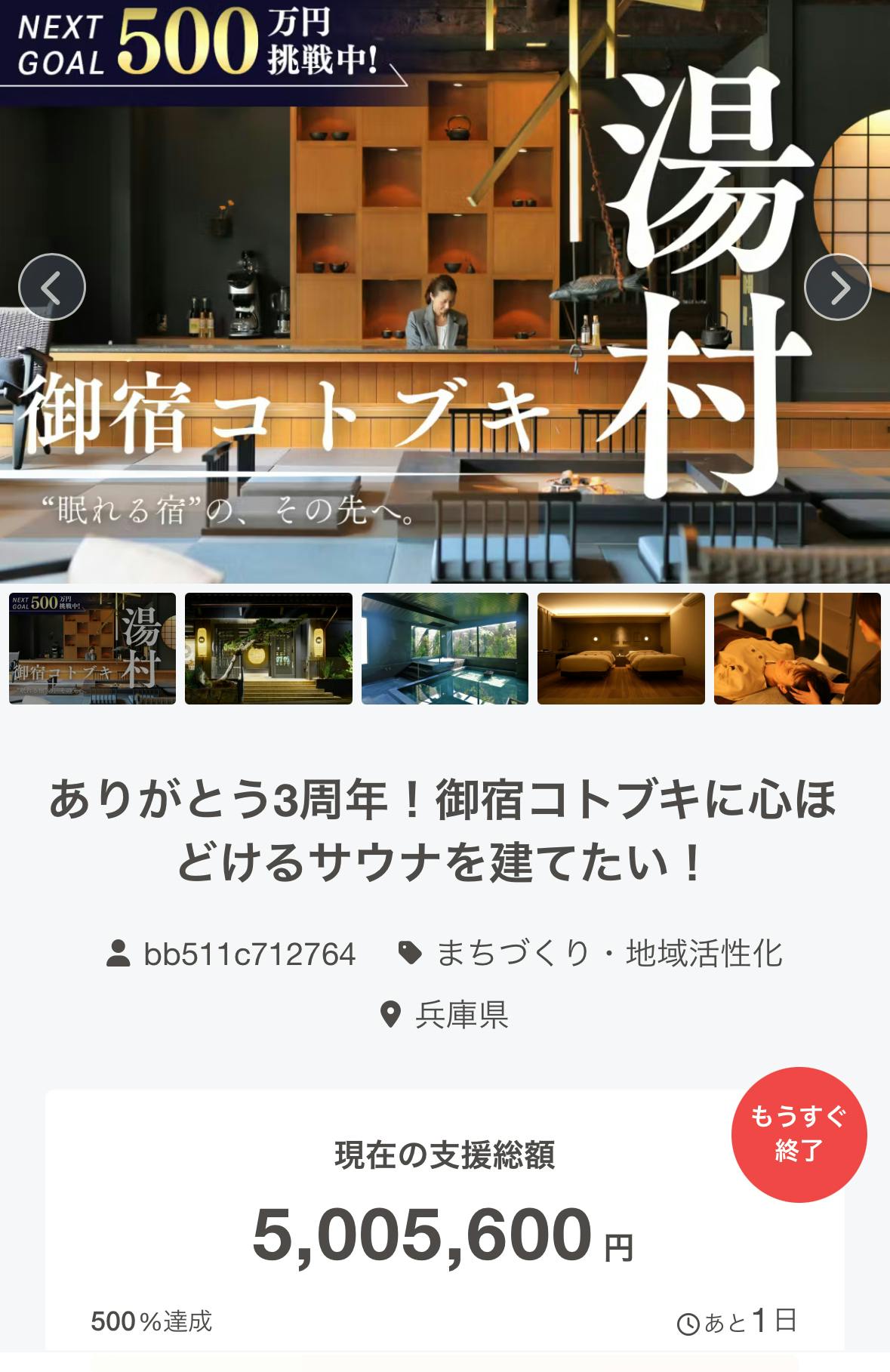 2025/06/29 22:32クラウドファンディング、残り1日。感謝しかありません。皆様、4月にスタートした「御宿コトブキにサウナ&露天風呂を作るクラウドファンディング」も、ついに明日が最終日となります。3月25日、スバキリ商店の小西代表とキックオフミーティングを行い、「キャンプファイヤーで旅館部門歴代1位を取る!」と意気込んでスタートしました。しかし、結果は惨敗。歴史も長く、しかもコロナ禍という厳しい状況で達成された過去の実績と比べること自体が無謀だったのかもしれません。ただ、インフルエンサーや広告に頼らず、創業3年目の旅館としての力だけで挑戦できたことを思えば、出せる結果の中では最高の結果だったと自分に言い聞かせています。戦略としては、まずファーストゴールを100万円に設定し、開始直後に20%以上(20万円)を達成してキャンプファイヤーで上位表示されることを狙っていました。実際には約半日で20%を達成し、初日でファーストゴールを達成できたので、予想外以上の滑り出しでした。その後、200万円、300万円と順調に進み、4月30日に400万円をネクストゴールに設定しましたが、そこから急に支援の勢いが止まってしまいました。5月は、チラシを配ったり、地道に活動報告を発信することしかできず、正直苦しい時期でした。そんな中、6月23日にようやく400万円を達成し、そのタイミングで最終ゴールを500万円に変更しました。ですが、正直その時点で大きな支援をお願いできる知人はほとんどおらず「これは厳しいかもしれない」と思いながらも、ここからはまさに「人事を尽くして天命を待つ」という心境で過ごしていました。クラウドファンディングは「最初の3日間と最後の3日間が勝負」と言われますが、本当にその通りで、最後の3日間は知人、会社関係、そしてどこかで御宿コトブキのクラウドファンディングを知ってくださった方々から、有難いことにご支援が次々と集まりました。そして、ついに目標達成まであと10万円を切ったところで支援が一旦止まり「明日が勝負だ」と思っていた矢先のことです。御宿コトブキのオープン時に大手広告会社の社員として出会い、今は起業して頑張っている20代の若手経営者の方が、なんと10万円の企業スポンサーとして支援してくださり、あっさりと目標を達成することができました。その時、正直「なんで!?」という驚きが湧き上がりました。というのも、彼とは別事業で集客を一緒に取り組むほど信頼関係があった一方、つい先日、御宿コトブキの集客業務で結果が出せず、自分の方から契約を終了したばかりだったのです。契約を切られた立場で、しかも起業間もない20代の彼にとって10万円は決して簡単に出せる金額ではなかったはずです。それなのに、なぜ? という気持ちのまま、彼にお礼の連絡をした時のやり取りは、本当に涙が出るほど嬉しいものでした。※本人には掲載の許可を頂いています。今回のクラウドファンディングでは、本当に多くの方々から温かいご支援をいただきました。昨日も書きましたが、クラウドファンディングには賛否両論ありますが、自分自身は挑戦して本当に良かったと思っています。「誰かに喜んでもらいたい」「誰かを笑顔にしたい」という気持ちは、人間が持つ最も素晴らしい感情だと思います。今回は自分が支援していただく立場でしたが、いただいたご恩は必ずどこかで恩送りし、次は誰かを支える側になりたいと強く思っています。長文になってしまいましたが、まずは500万円の最終ゴール達成のご報告と、心からの感謝を申し上げます**。クラウドファンディングは明日残り1日続きます。最後まで応援いただけますと幸いです。どうぞよろしくお願いいたします。 もっと見る