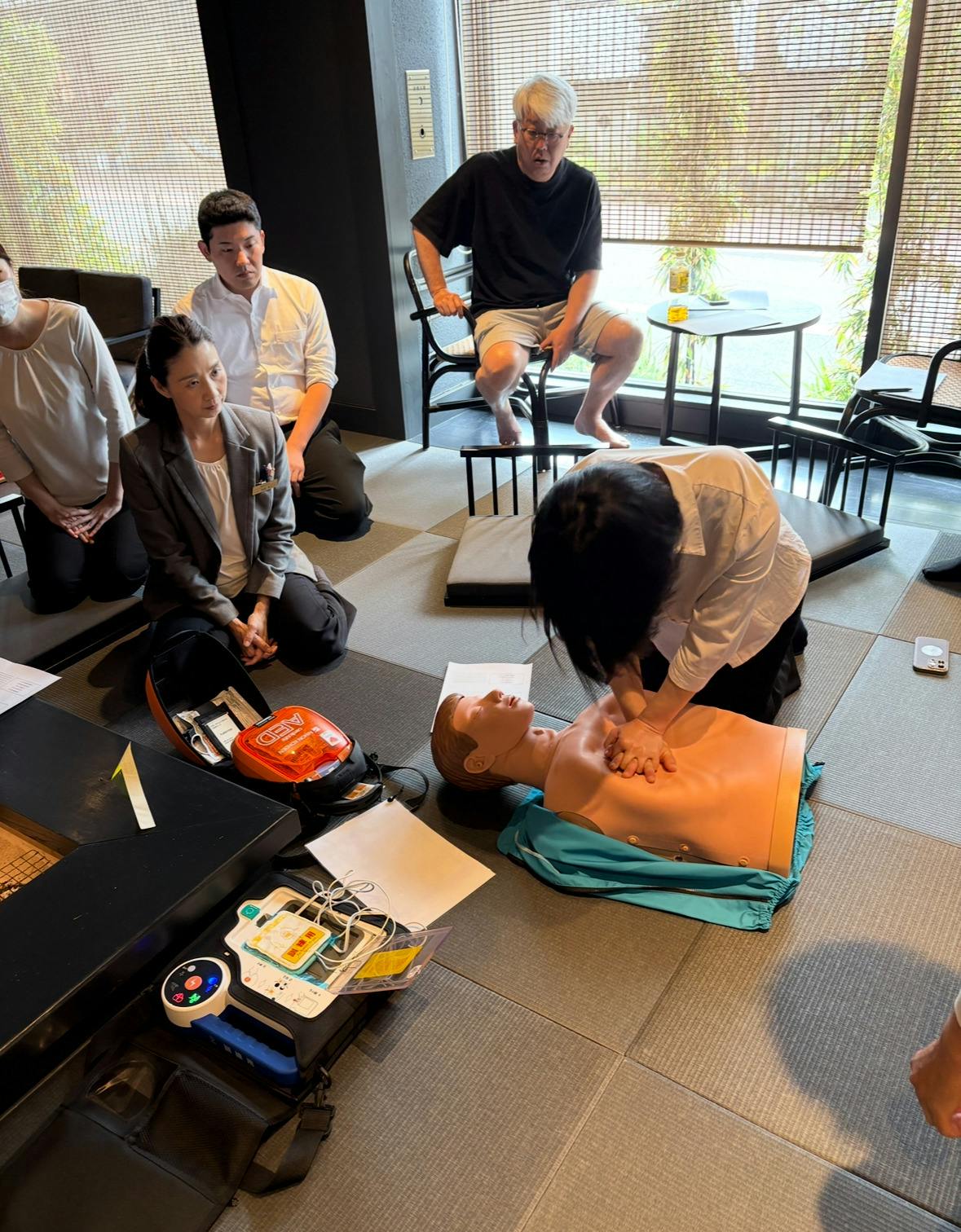 研修では、心肺蘇生(心臓マッサージ)やAEDの使用訓練など、可能な限り実際の状況を想定し、実践的な内容に取り組みました。また、主訴ごとにお客様の急変の兆候を見極められるように作成したマニュアルを、1階フロントと2階レストランに常設し、スタッフが冷静かつ迅速に対応できる体制を整えました。