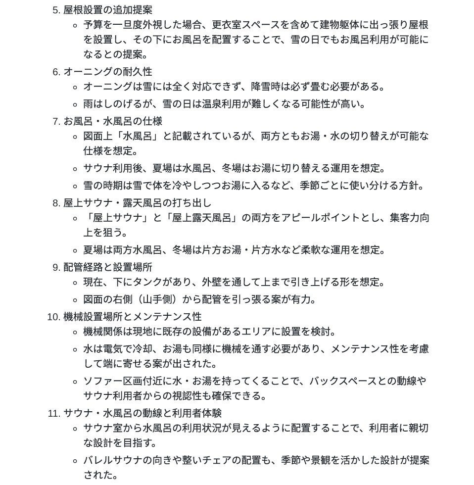 真夏の熱い時期は冷たい水風呂でキュッと整って、冬は雪見風呂でほっこり…なんて妄想がふくらみます。ソファを置いて、予約制のラグジュアリー貸切にする案も出たけど、若いお客さんには「自由に使える方がいいんじゃない?」って意見あったり、オペレーションや人員配置のい問題だったり色々意見が出て、最終的には、フリー利用メインで考えて、混雑しないように人数管理する方法を詰めていくことになりそうです。ここも色々な意見を聞いていきます。