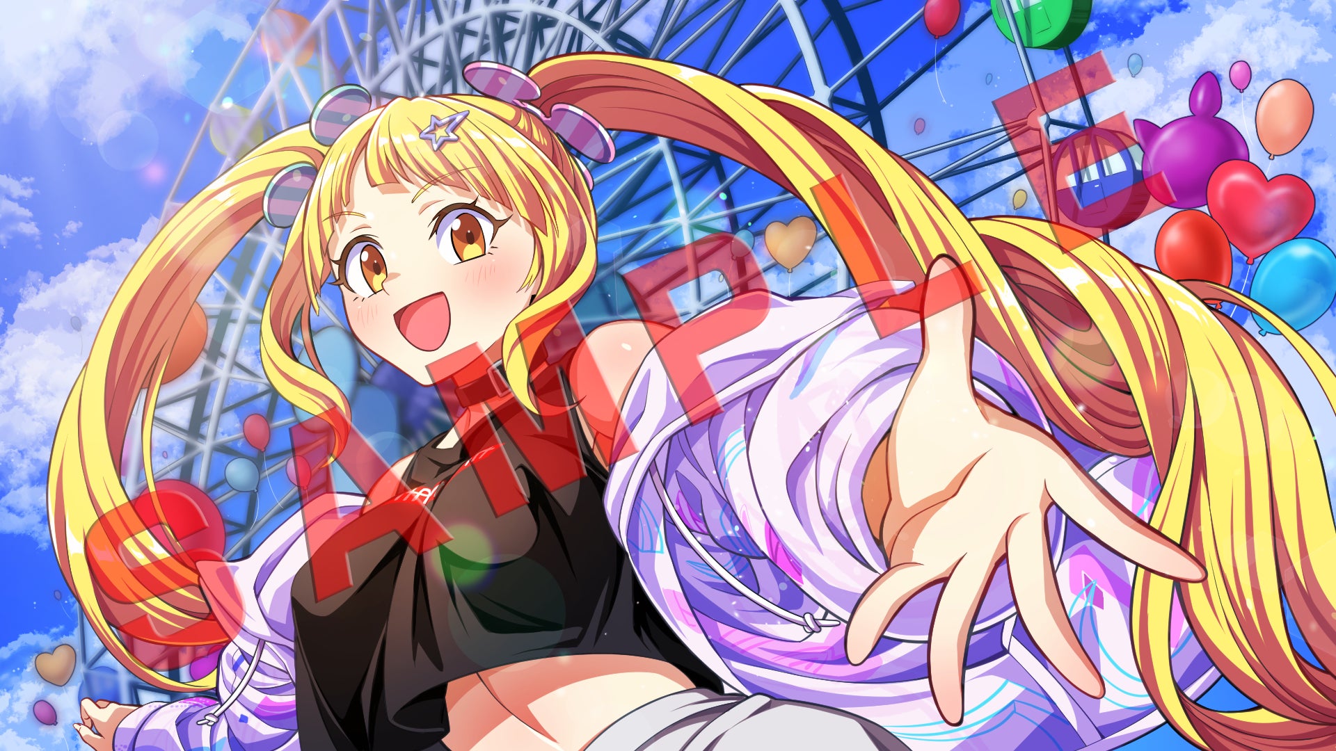 家族やルクスリアたちと遊園地に来て、ウキウキしているここあのイラストです。