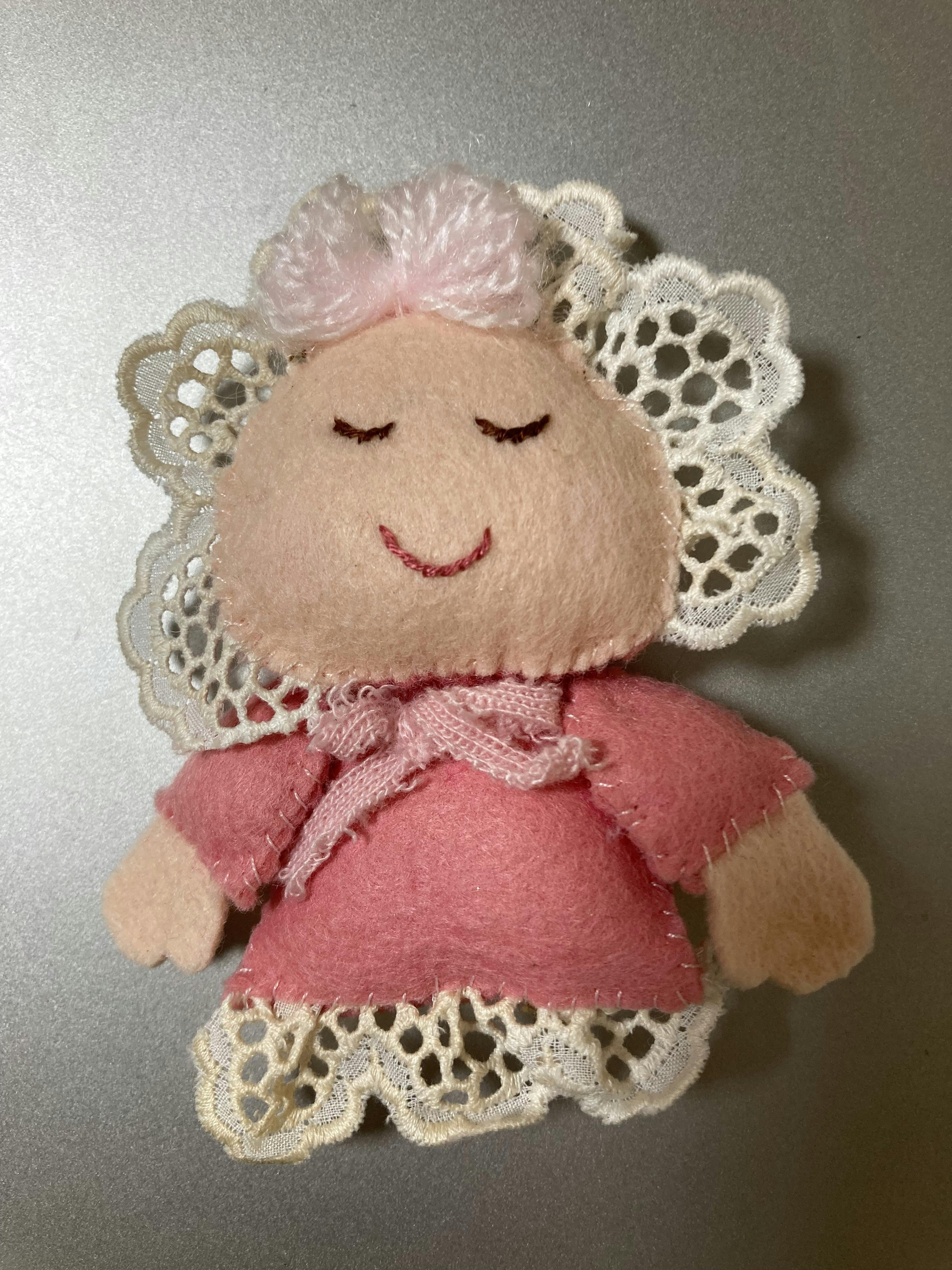 私は、和代ちゃんが作ってくれたマスコット人形なの。身長10cmとミニサイズです。ご支援のリターンにもうすぐお見えします。もししばらくお待ちいただけますようお願いします。他にも、和代ちゃん直筆のローズィちゃんのポストカードや綺麗なお花のポストカード、オンラインのファッションに関する相談等を準備中です。わ〜、楽しみだなぁ。