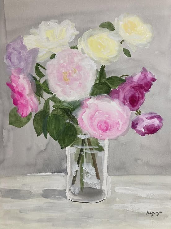ご近所のお庭で奥様とバラ談議。つい長くいてしまいました。美しいバラに癒されました。いただいてきたバラをガッシュで描きました。