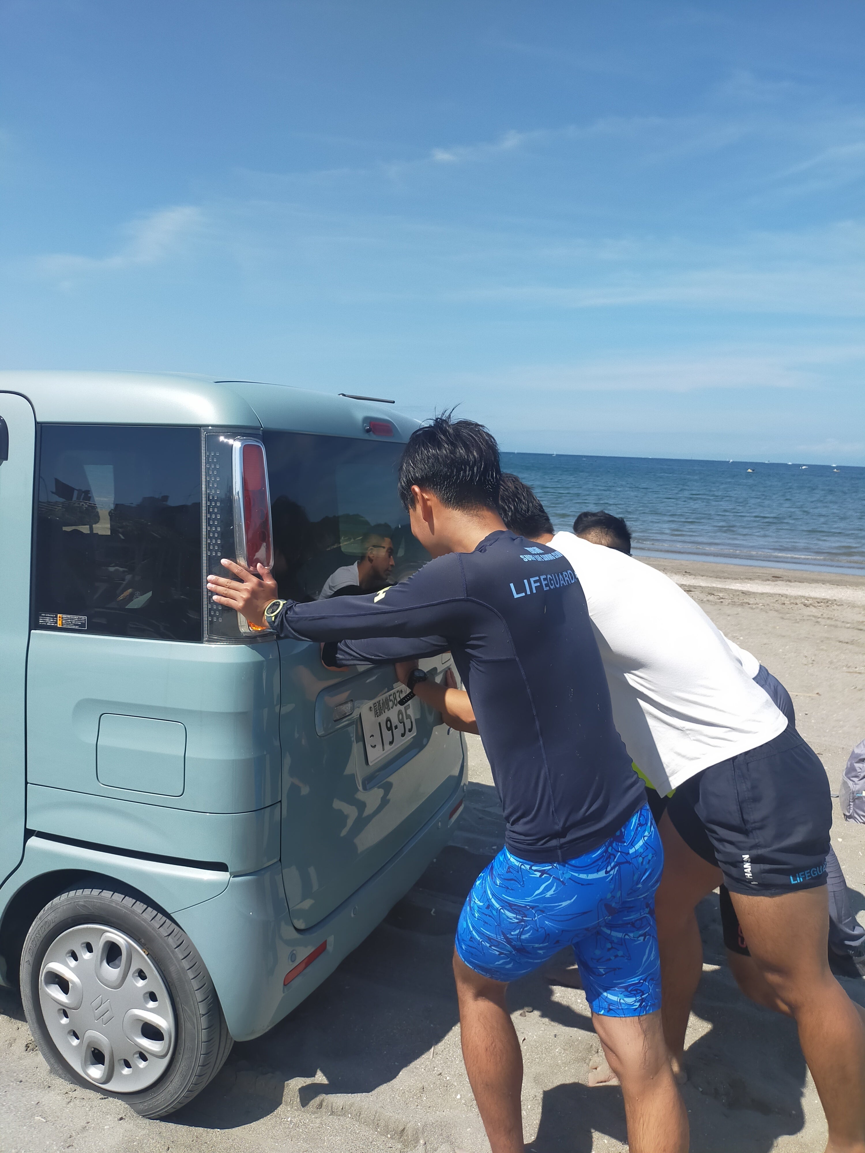 Accident!!青年たちがすぐさま駆け寄ってきてくださり、近くの海の家建設中の大工さんが板を貸してくださり、海に居た方々が助けて下さいました!ありがとうございました。