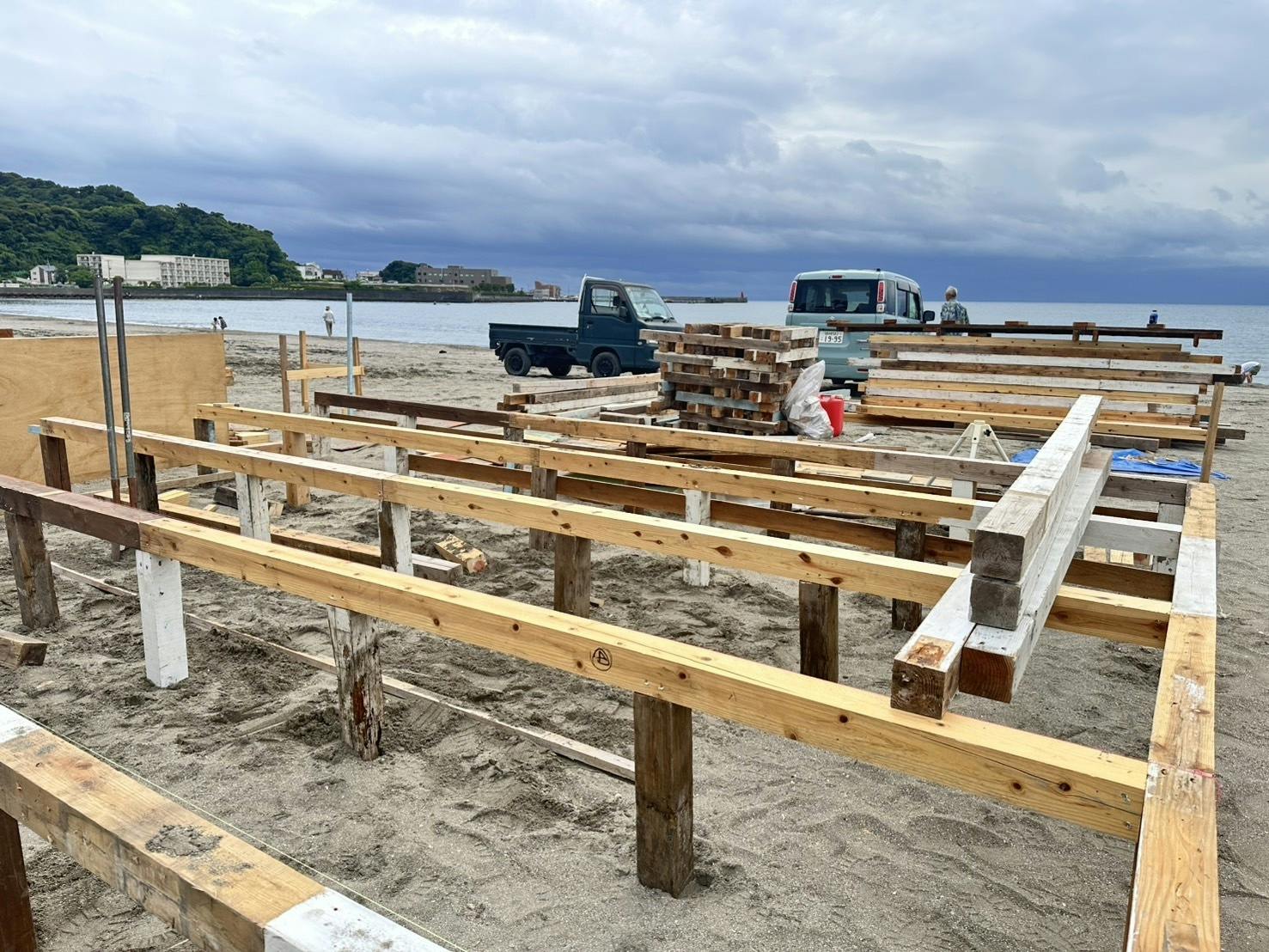 5/28 地割ついに本格始動!それぞれの場所を区切ります。(組合の皆様お疲れ様でした)1ヶ月後〜の66日間老若男女皆様の笑顔で溢れる逗子海岸でありますように!!