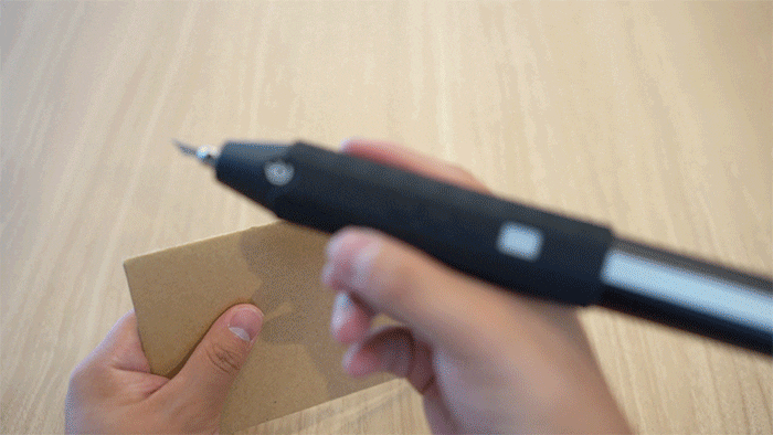 電源OFF時には通常のカッターのように力をグッとかけないと切れませんが、電源ONでは軽い力でスッーと刃が進みました! これなら長時間の作業でも疲れ知らずでやれそうです。