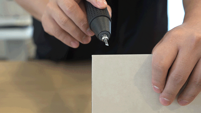 一般的なカッターナイフでは何回〜何十回と往復が必要な厚めのPVCフロアタイルもご覧の通り。DIYで部屋を模様替えするときにも助かりそう。