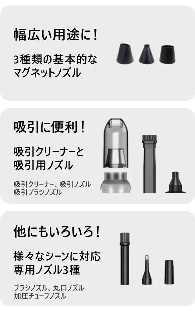 ノズルを変えてエアダスターから吸引清掃、空気入れまで幅広い用途に使用できます。