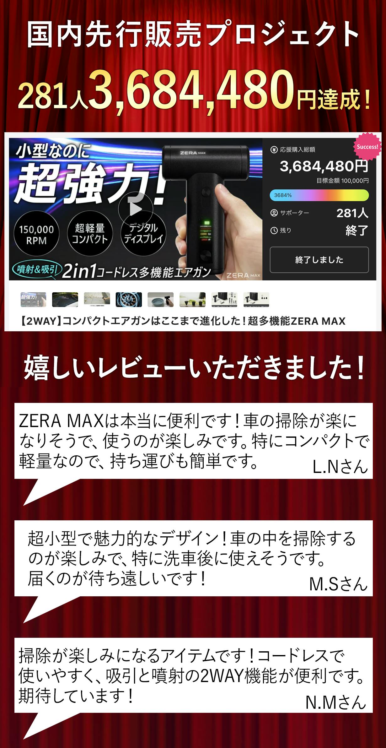 2025/08/01 00:34ご支援者様、【2WAY】コンパクトエアダスターはここまで進化した!超多機能ZERA MAXにご興味をお持ちいただきありがとうございます。プロジェクト開始から40日目で100人ものご支援者の方々より支援頂き、無事プロジェクト終了を迎えることが出来ました。早速皆様のリターンを2025年10月末にお届けできるよう準備を始めております!皆様にご満足いただけるリターンをお届けできるよう、全力で取り組んで参りますので引き続き、「【2WAY】コンパクトエアダスターはここまで進化した!超多機能ZERA MAX」をよろしくお願い致します。BRIGHTチーム もっと見るLifehackerでの掲載ページ紹介!