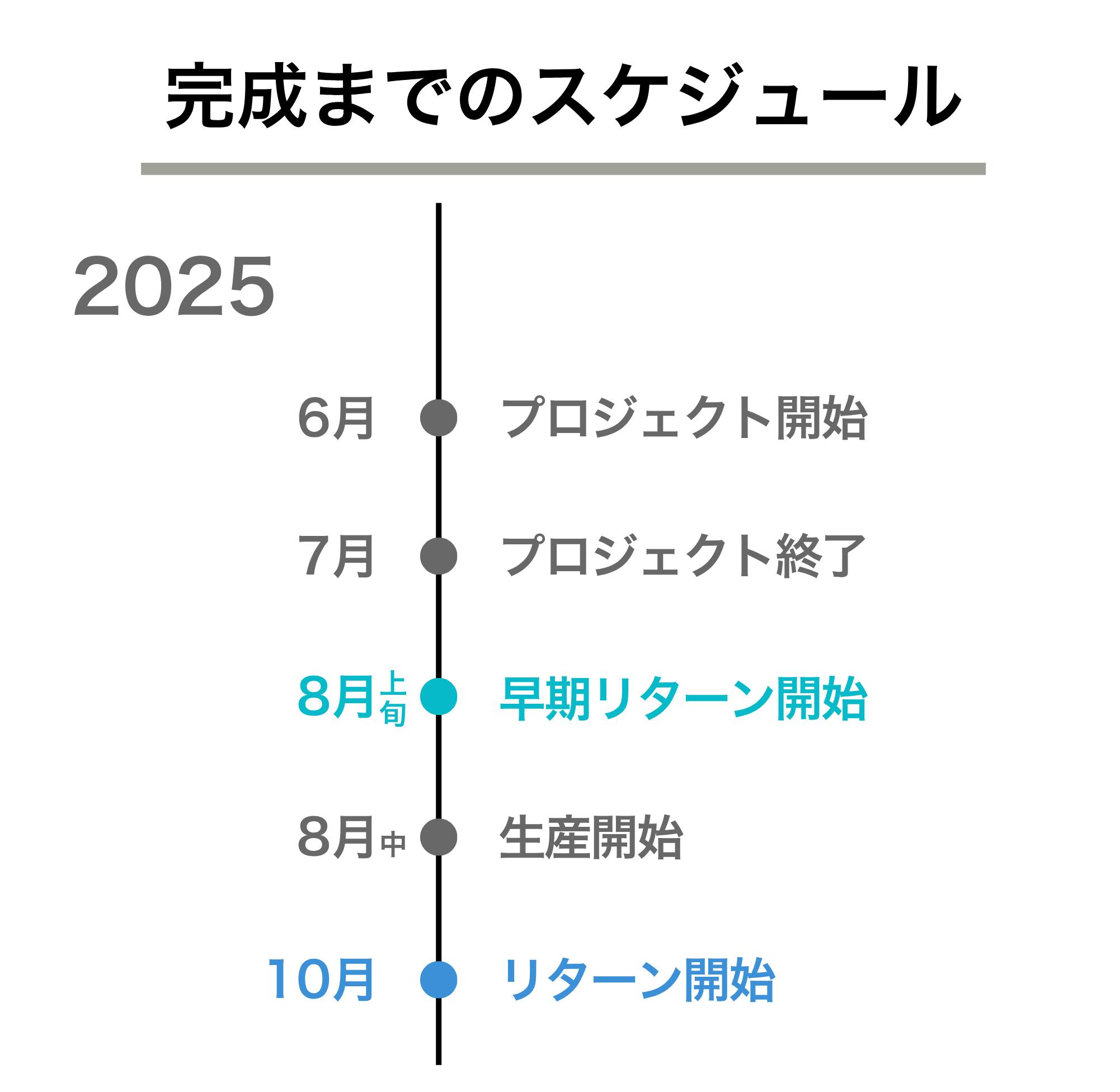 ※本文中に記載させていただいたスケジュールは、あくまでプロジェクト公開時点の予定です。クラウドファンディングを経て輸入を行う性質上、配送遅延のおそれがございます。