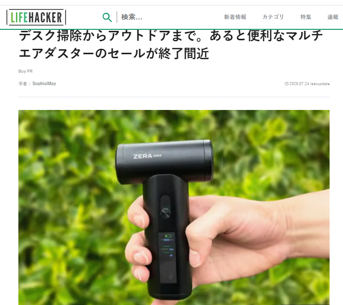 皆様、こんばんは!Brightチームです。7月24日、Lifehackerで「ZERA MAX」を紹介して頂きました。話題:デスク掃除からアウトドアまで。あると便利なマルチエアダスターのセールが終了間近興味がある方、是非下記のリンクからアクセスしてみてください。https://www.lifehacker.jp/article/machi-ya-zeramax-airduster-end-840912/ 【レビューの一部抜粋】〈噴射も吸引も一台で完結「ZERA MAX」は、吹き飛ばす・吸い取る・空気を送るの3役を1台でこなす電動エアダスター。アタッチメントは磁石着脱式で、使いたいシーンに合わせてサッと切り替え可能。噴射モードでは最大風速55m/s。キーボードやゲーム機の吸気口、冷却ファン、フィルターの細かい目にも風が届き、目に見えてホコリが取れるのはスッキリしますね! 「ZERA MAX」は吸引モードも搭載。噴射口と反対側が吸引口になっているため、クリーナー用アタッチメントを使ってミニ掃除機に変身します。〉ご興味のある方はこの機会をお見逃しなく!https://camp-fire.jp/projects/840912/view7月31日まで販売期間は続きますので、ぜひSNSでのシェアや身近な方にもおすすめしていただけると嬉しく思います。#zeramax#brightdiyどうぞよろしくお願い致します。BRIGHTチーム