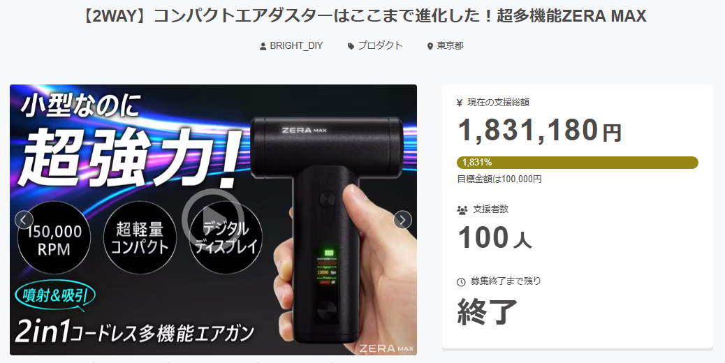 ご支援者様、【2WAY】コンパクトエアダスターはここまで進化した!超多機能ZERA MAXにご興味をお持ちいただきありがとうございます。プロジェクト開始から40日目で100人ものご支援者の方々より支援頂き、無事プロジェクト終了を迎えることが出来ました。早速皆様のリターンを2025年10月末にお届けできるよう準備を始めております!皆様にご満足いただけるリターンをお届けできるよう、全力で取り組んで参りますので引き続き、「【2WAY】コンパクトエアダスターはここまで進化した!超多機能ZERA MAX」をよろしくお願い致します。BRIGHTチーム