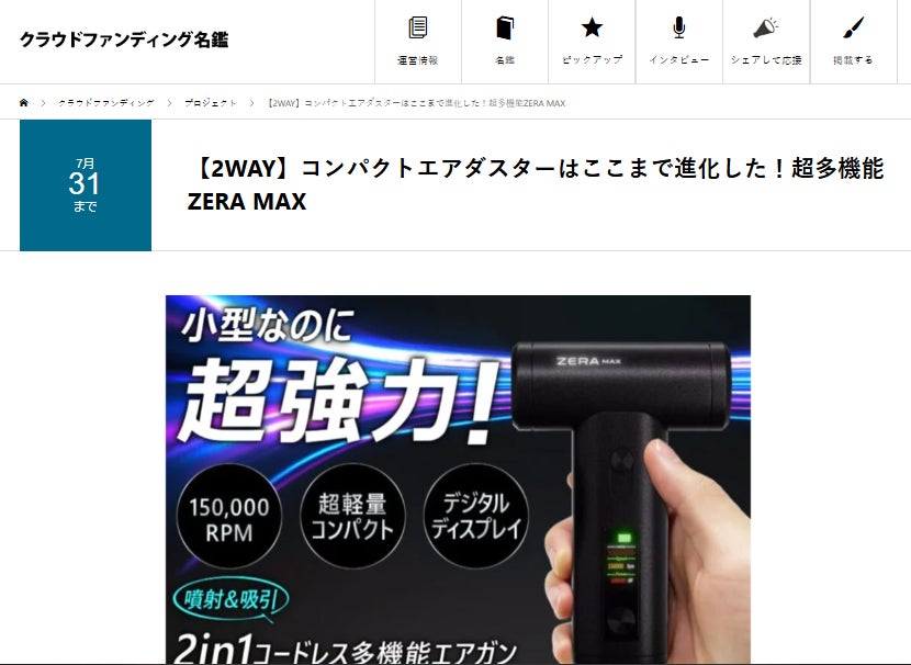 皆様、こんばんは!Brightチームです。先日、クラウドファンディング名鑑で「ZERA MAX」を紹介して頂きました。話題:【2WAY】コンパクトエアダスターはここまで進化した!超多機能ZERA MAX興味がある方、是非下記のリンクからアクセスしてみてください。https://crowdfunding.meikan.org/project/campfire-840912/【レビューの一部抜粋】〈コードレスエアダスターZERA MAXの魅力今回ご紹介するのは、Huizhou Haoweike Technology Co., Ltdが開発した「ZERA MAX」というコードレスエアダスターです。最大150,000RPMの超パワフルなモーターを搭載し、噴射と吸引の両方が可能な2in1タイプのガジェットです。コンパクトで軽量な設計なので、アウトドアや車内清掃など様々なシーンで活躍します。特に車内の汚れを手軽に吹き飛ばしたり吸い取ったりできるため、レジャー後の掃除が楽になる点が大きな特徴です。さらに、充電残量やモータースピードをリアルタイムで確認できる大画面ディスプレイも搭載されており、使い勝手の良さも魅力の一つです。多機能ノズルと使いやすさZERA MAXには9種類の多機能ノズルが付属しており、エアダスターとしての噴射だけでなく、吸引清掃や空気入れ、扇風機としても利用できます。ノズルはマグネット式で簡単に取り付け・取り外しができるため、作業中のストレスを軽減します。また、基本のマグネットノズル3種だけのシンプルなベーシックセットも用意されており、用途に応じて選べるのも嬉しいポイントです。4000mAhのロングライフバッテリーを搭載し、Type-C充電に対応しているため、外出先でも充電しやすく便利に使えます。 〉ご興味のある方はこの機会をお見逃しなく!https://camp-fire.jp/projects/840912/view7月31日まで販売期間は続きますので、ぜひSNSでのシェアや身近な方にもおすすめしていただけると嬉しく思います。#zeramax#brightdiyどうぞよろしくお願い致します。BRIGHTチーム