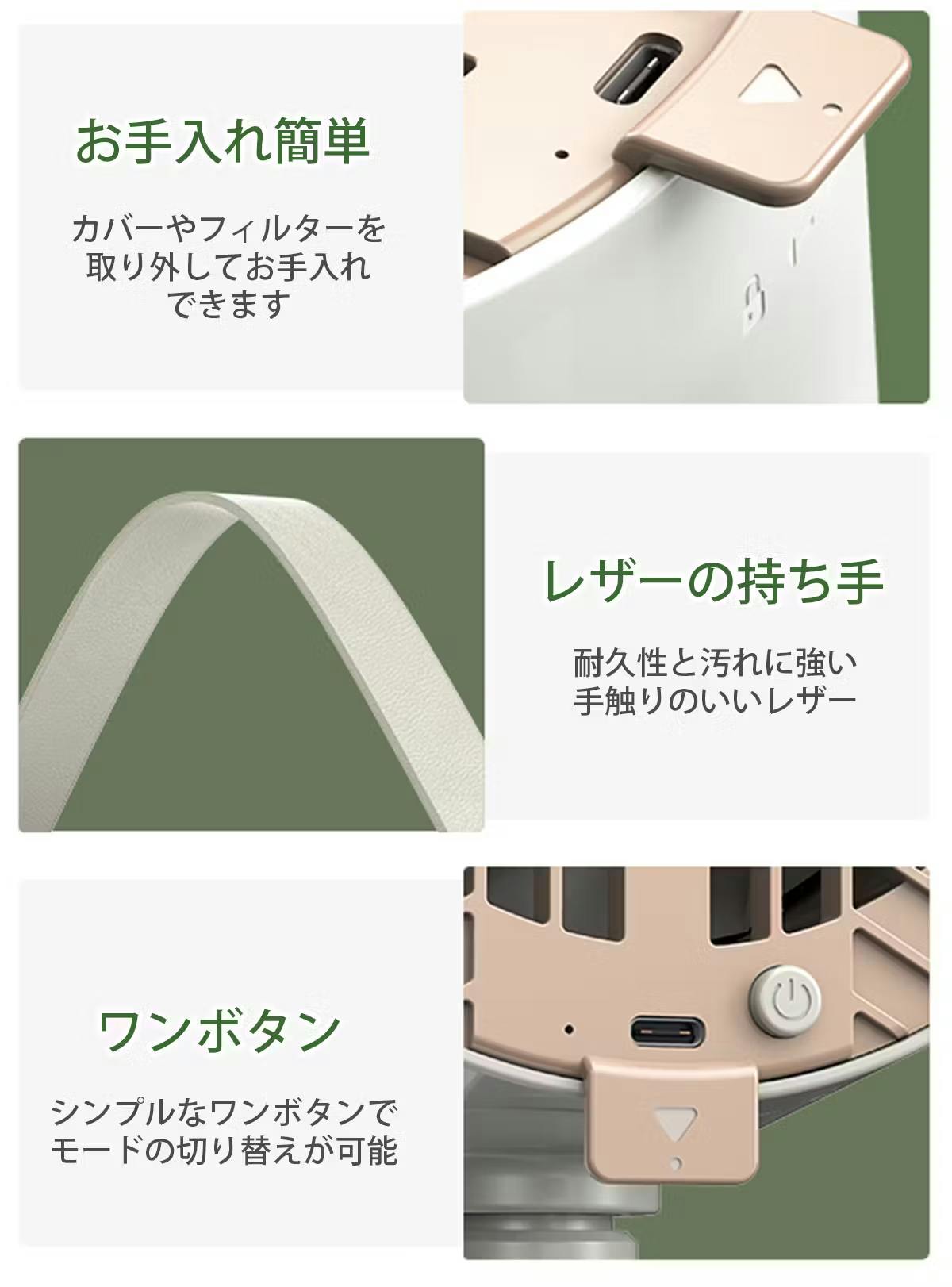 ・レザーの持ち手:耐久性が高く、汚れに強い手触りの良いレザー素材を採用。