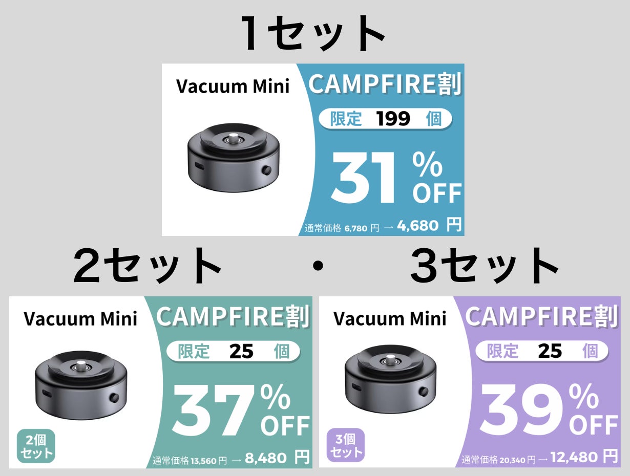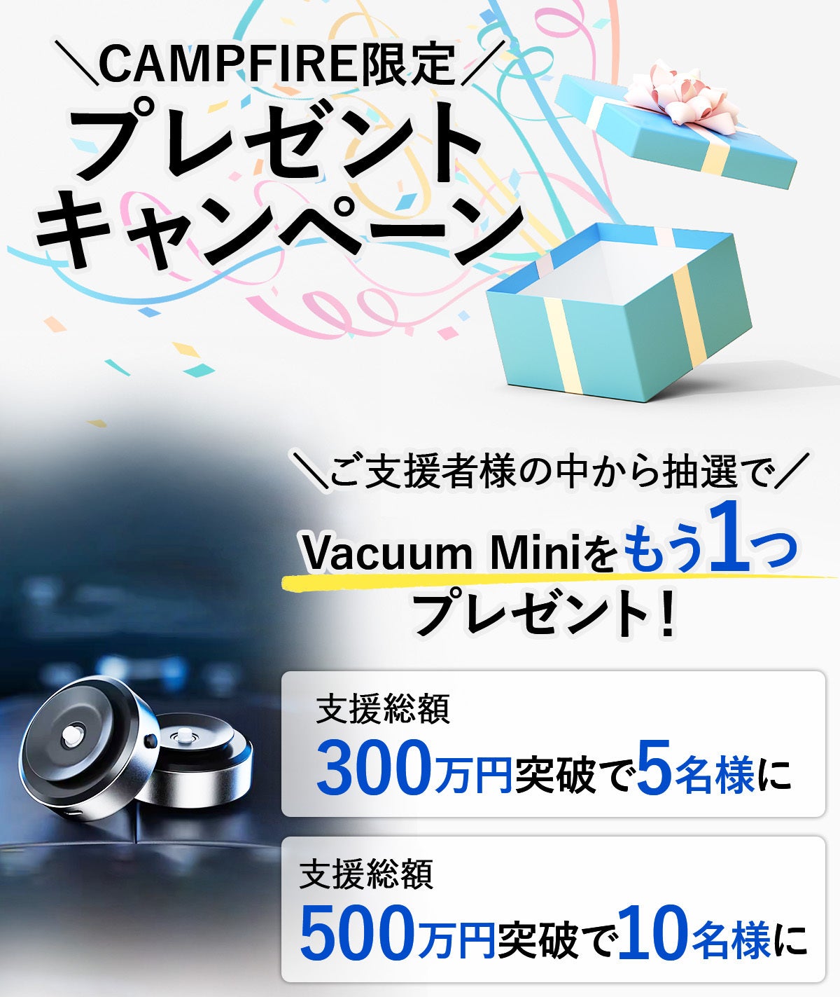大好評をいただき大成功したVacuumシリーズの新作登場を記念して、CAMPFIREだけの購入者限定プレゼントキャンペーンを実施します!ご支援者様の中から抽選で当たった方に、なんとVacuum Miniをもう1つプレゼント!!