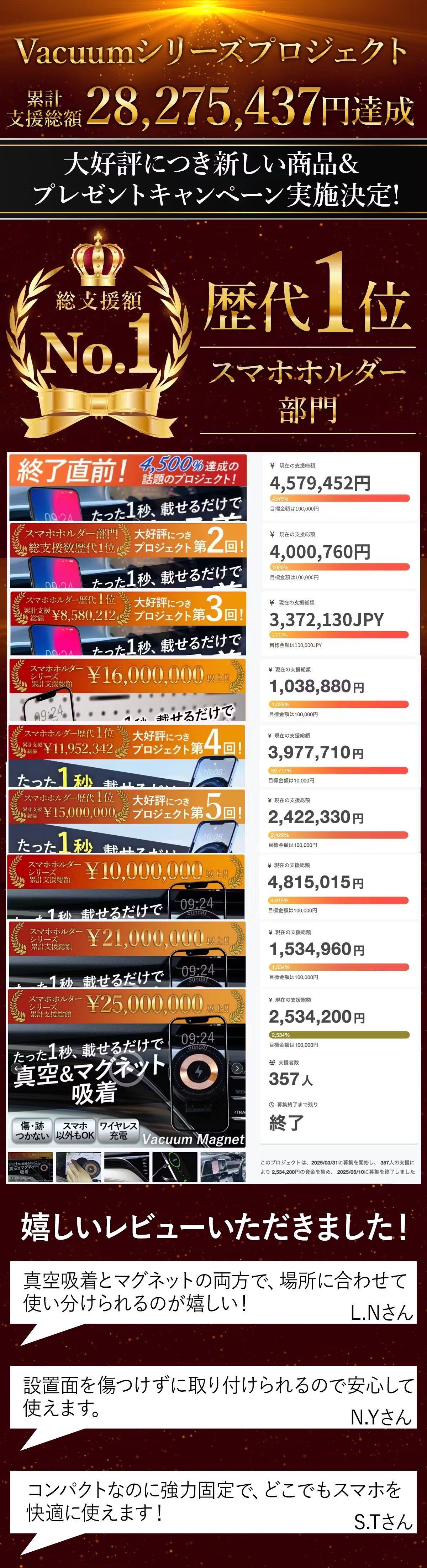 2026/04/03 21:00\Vacuum Magnet紹介/こんばんは、BRIGHT DIYです。今回は皆さまに「真空吸着で強力固定、ワイヤレス充電対応、コンパクトで持ち運びも便利、スマホやタブレットの使い勝手が向上する」プロジェクトを紹介させて頂きます。プレビューページをお気に入り登録して公開をお待ちください! 固定したままワイヤレス充電OK!真空&磁気吸着式折りたたみスマホホルダー最大割引は41%OFF!高割引率は数量限定です!ここだけの限定割引を見逃さないよう、ぜひお気に入り登録して公開をお待ちください!お気に入り登録することで公開されたらメールでお知らせいたします!プレビューページはこちら >>> https://camp-fire.jp/projects/911828/view※早期リターンは在庫がなくなり次第終了となります。大人気で終了したVacuumシリーズ最新作が登場!プレゼントキャンペーン付きプロジェクトを実施します!外れにくいのに、取り外すときは超簡単ワンボタン!プレビューページはこちら >>> https://camp-fire.jp/projects/911828/view今後とも、何卒よろしくお願い致します。BRIGHTチーム もっと見る