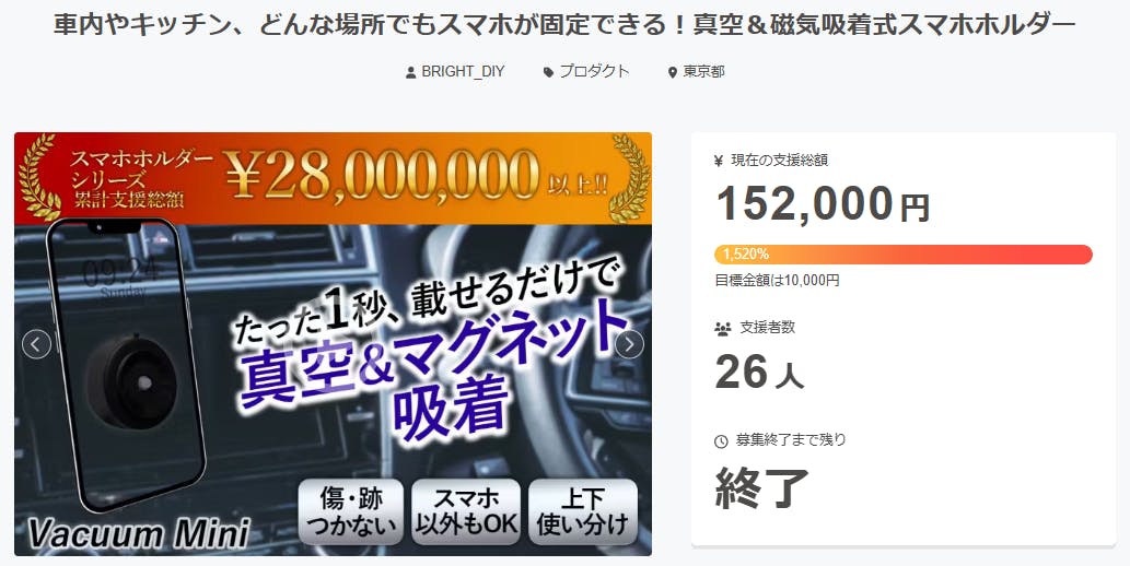 ご支援者様、車内やキッチン、どんな場所でもスマホが固定できる!真空&磁気吸着式スマホホルダーにご興味をお持ちいただきありがとうございます。