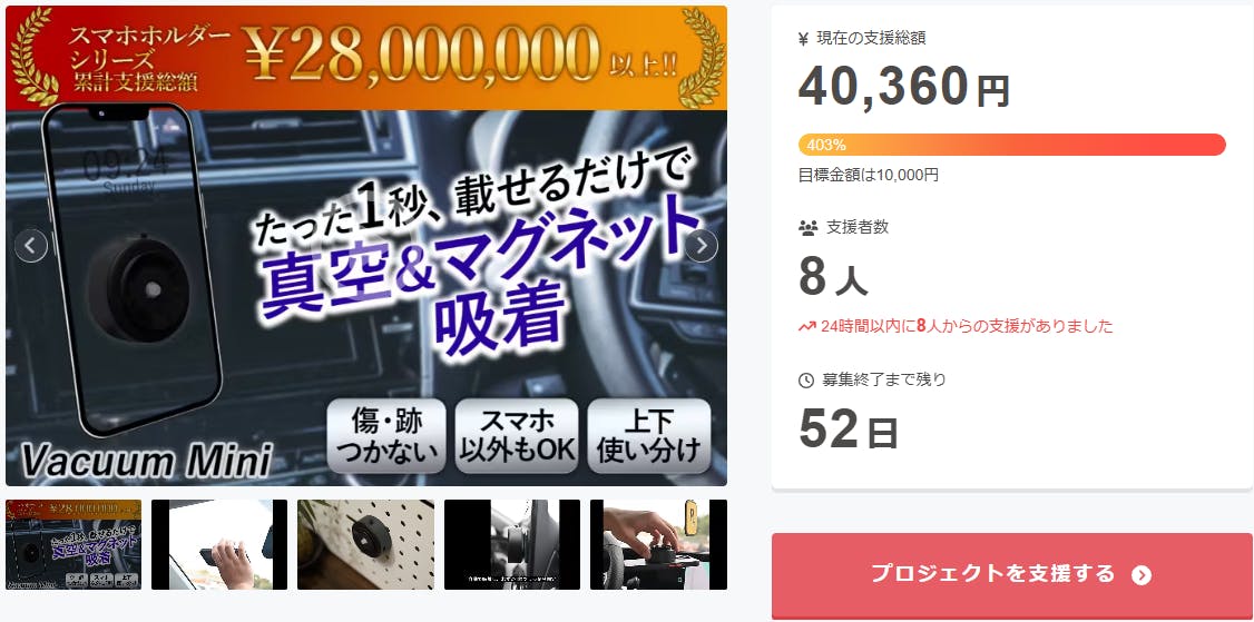 皆さんこんにちは、Brightチームです。この度は「車内やキッチン、どんな場所でもスマホが固定できる!真空&磁気吸着式スマホホルダー」を支援 いただき、本当にありがとうございます。お陰様で、開始から1分経たずに10万円の目標金額を100%達成することができました。人気ランキングのプロダクト部門 8 位に入賞することが出来ました!Vacuum Miniは自動吸着システムを採用!平滑面に置くだけで自動検知し、自動で吸引が始まることで接着面が真空になります。31日7月旬まで販売期間は続きますので、ぜひSNSでのシェアや身近な方にもおすすめしていただけると嬉しく思います。https://camp-fire.jp/projects/840920/viewどうぞよろしくお願いいたします。ありがとうございました。スタッフ一同