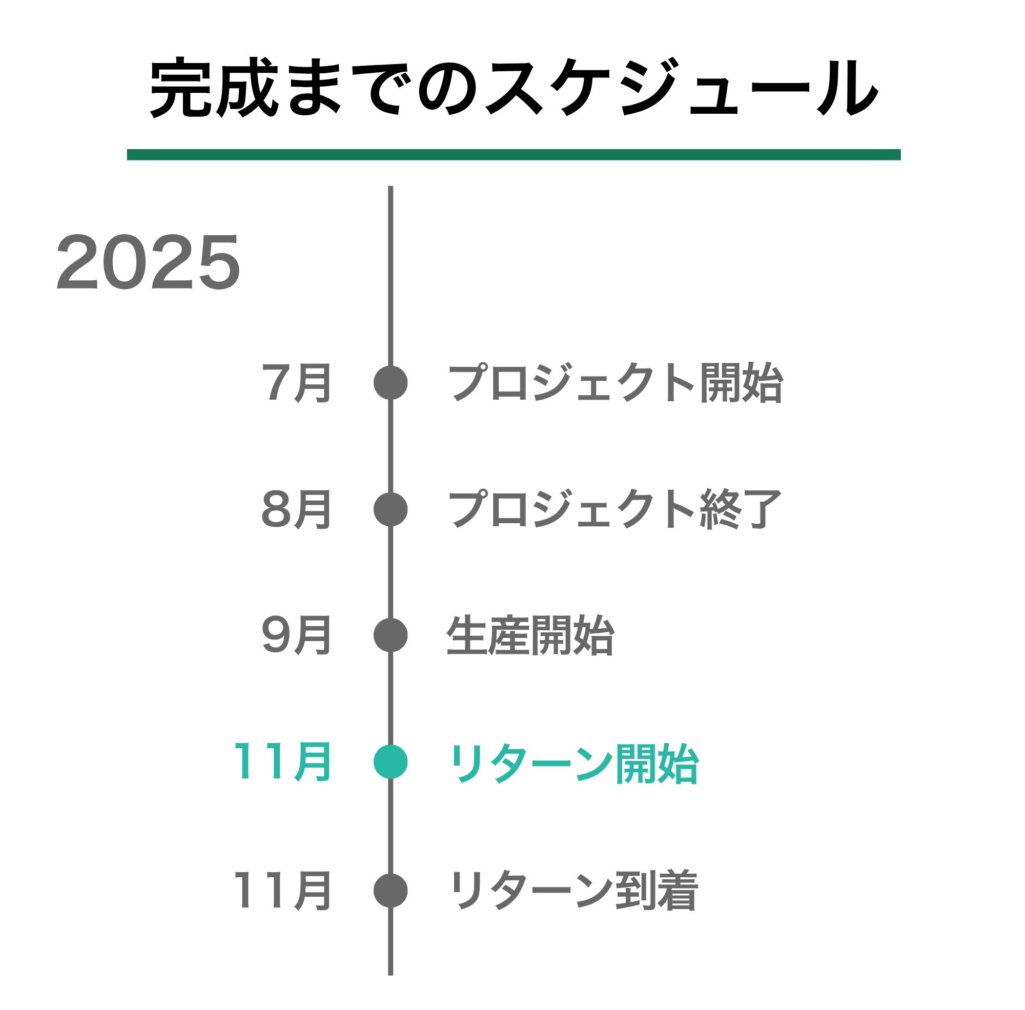 ※本文中に記載させていただいたスケジュールは、あくまでプロジェクト公開時点の予定です。クラウドファンディングを経て輸入を行う性質上、配送遅延のおそれがございます。