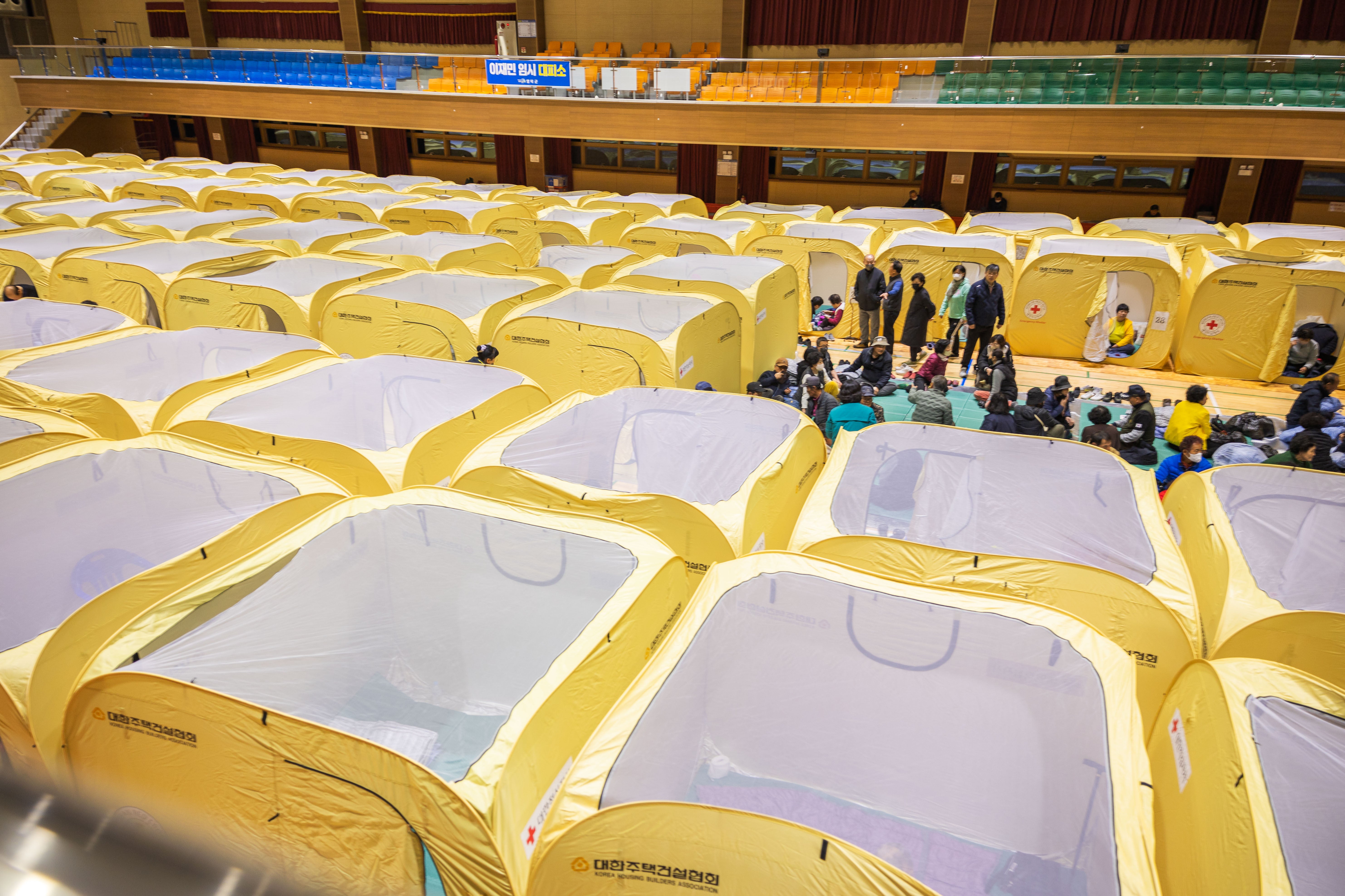 ヨンドクは、今回の山火事による被害が顕著に拡大したエリアのひとつ。この日、最初に訪れた避難所は地元行政と赤十字によってオーガナイズされ、ところ狭しと設営されたおよそ80張の簡易テントに、それぞれ複数の方が避難されていました。