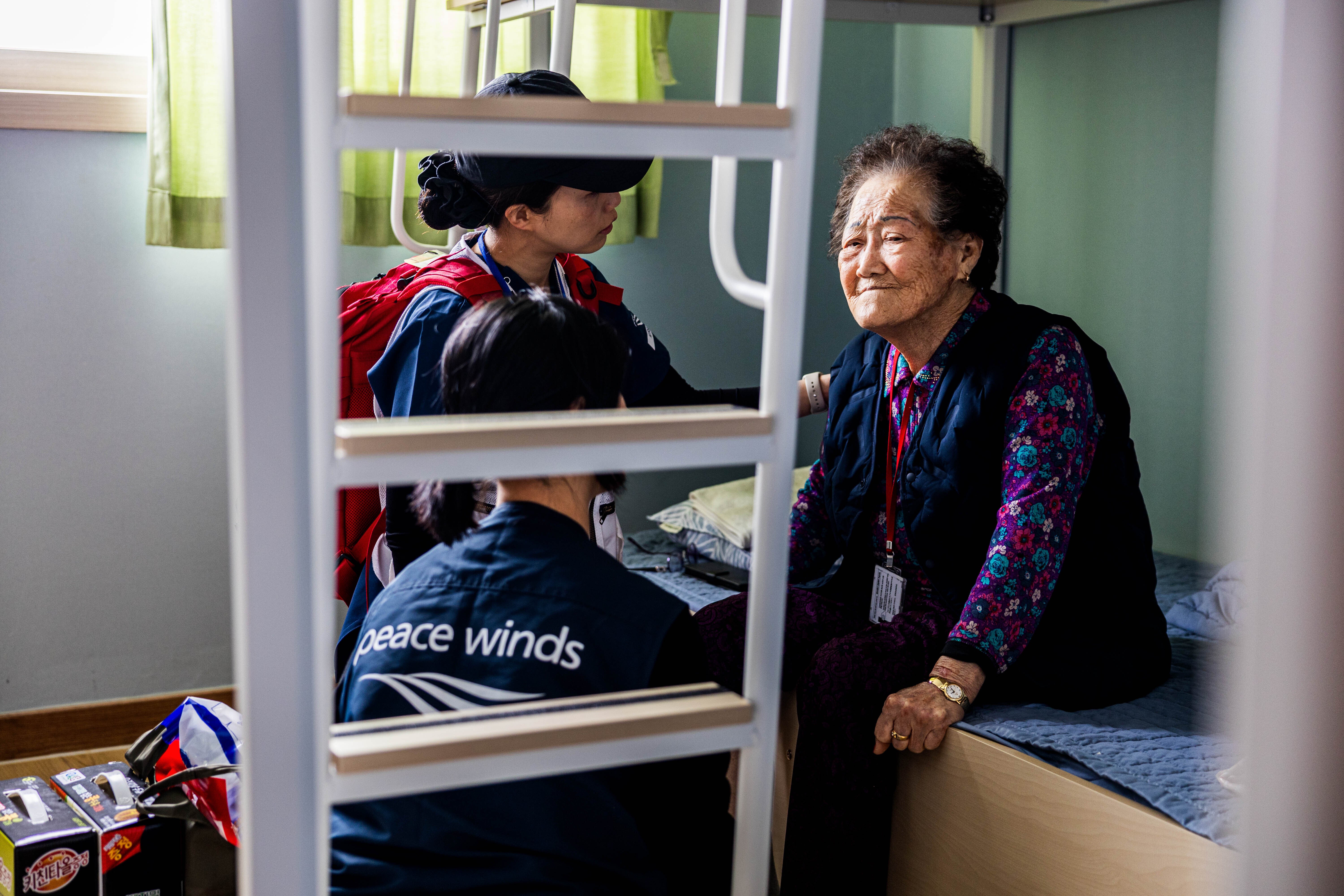 ひと部屋ずつ被災者を訪問して必要な物資を手渡しながら、看護師が話をすると避難者からは、特に健康の悩みが次々と聞かれました。不安からくる不眠症、肩や腰のこり、持病が原因の体のむくみなど、日本の避難所でもよく聞かれる症状がここ韓国の避難所でも現れています。避難生活が長期化すれば、災害関連死も懸念される状況です。