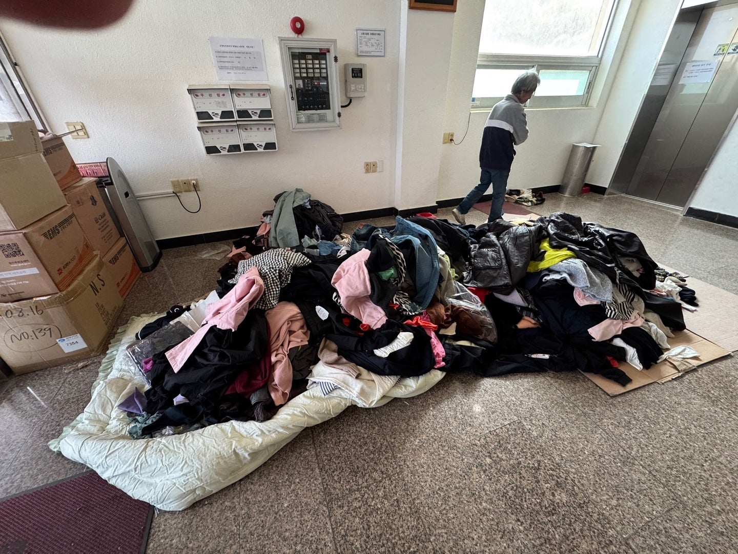 4月3日には、約50人が滞在しているモーテルを訪問し、実態調査を行いました。目についたのは、モーテルの入り口に山のように積み上げられた衣類です。救援物資として届いたものですが、聞いてみると、ほとんどがサイズが小さすぎて着られない服や下着だったとのこと。お年寄りが多い地域の特性上、必要なのはゆったりとしたサイズの服だったのですが、ニーズと支援が嚙み合わずこうした残念な結果になってしまいました。