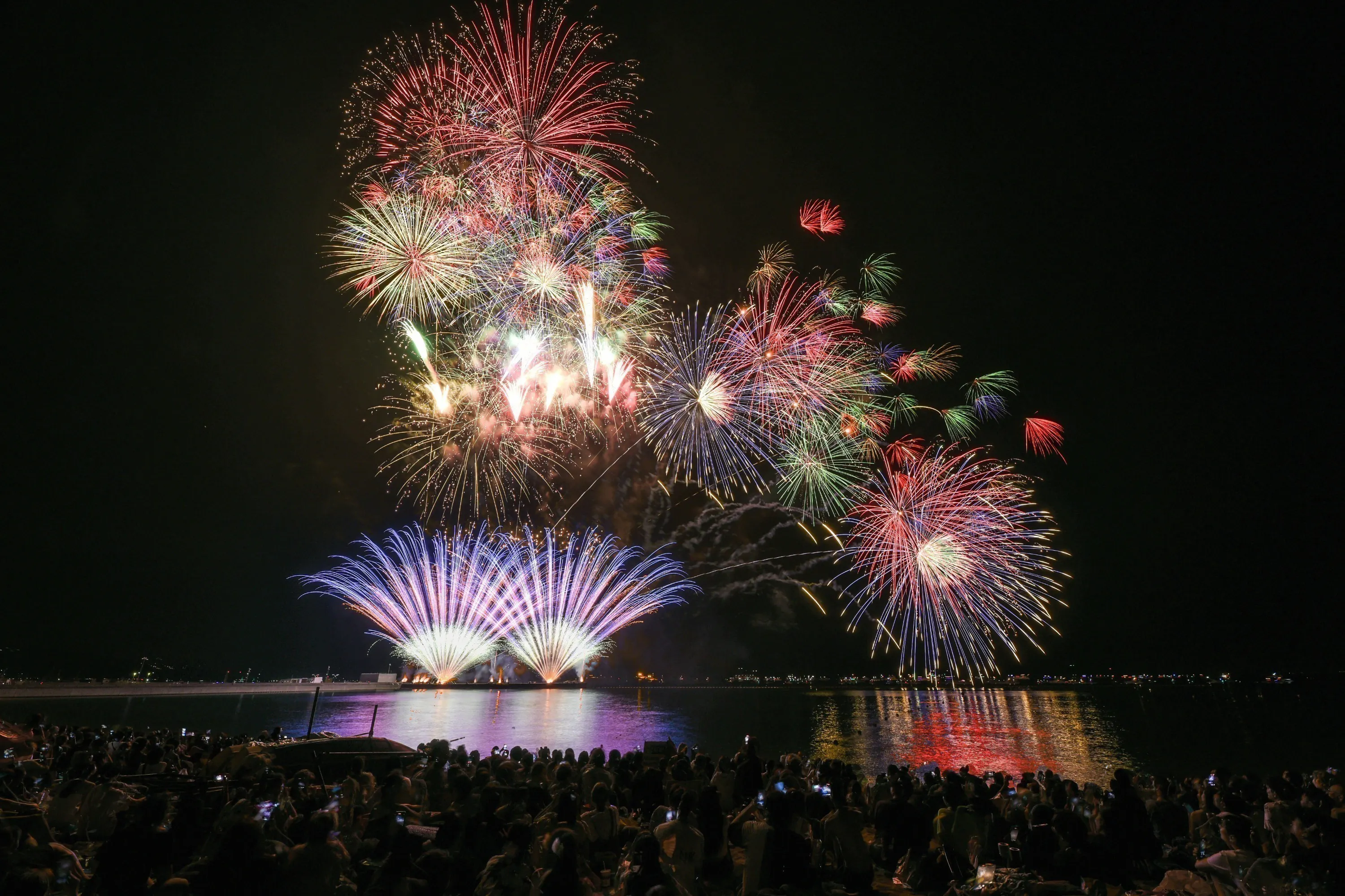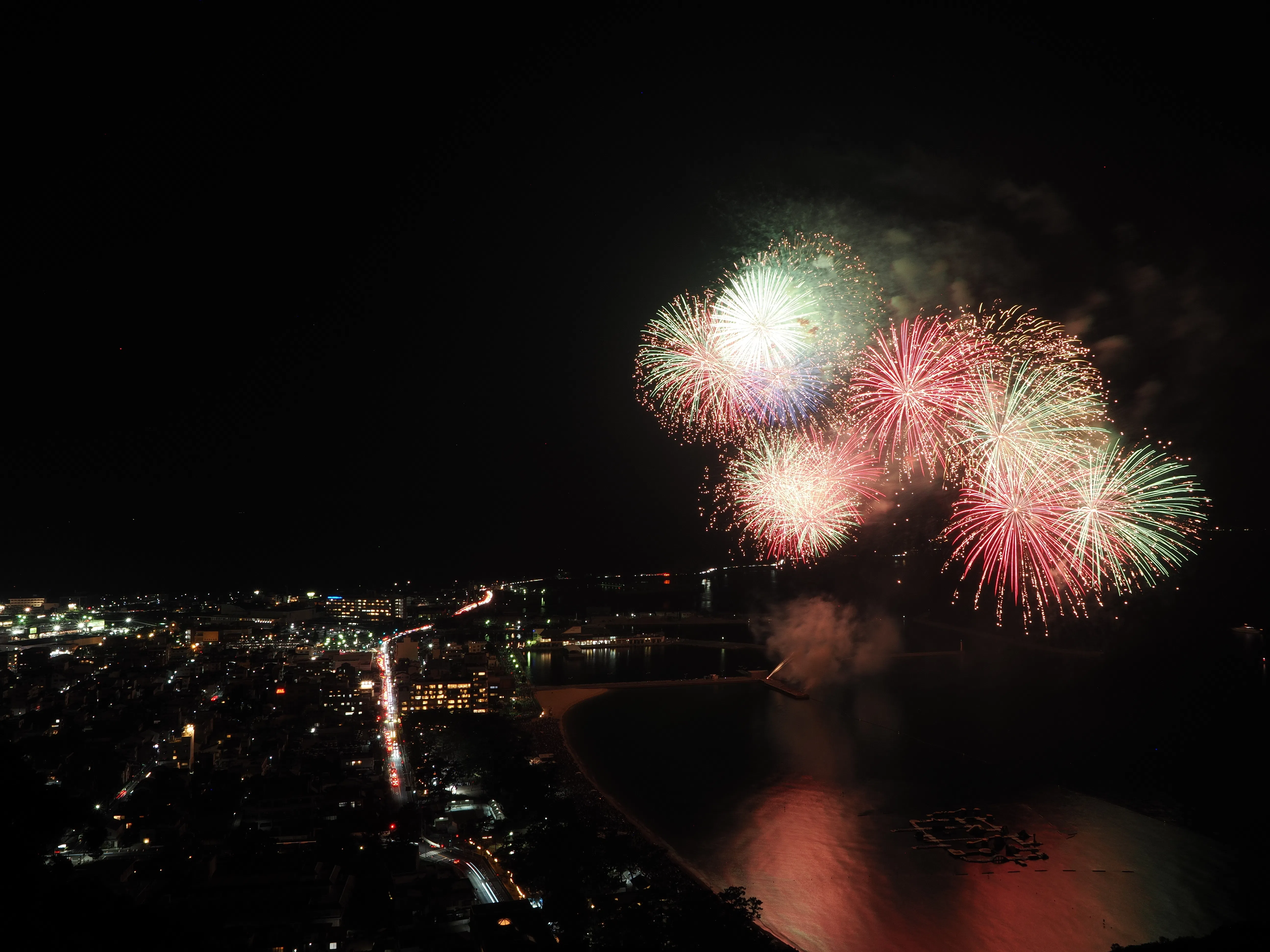 秋の澄んだ空気の中、波音に包まれながら見上げる大輪の花火。