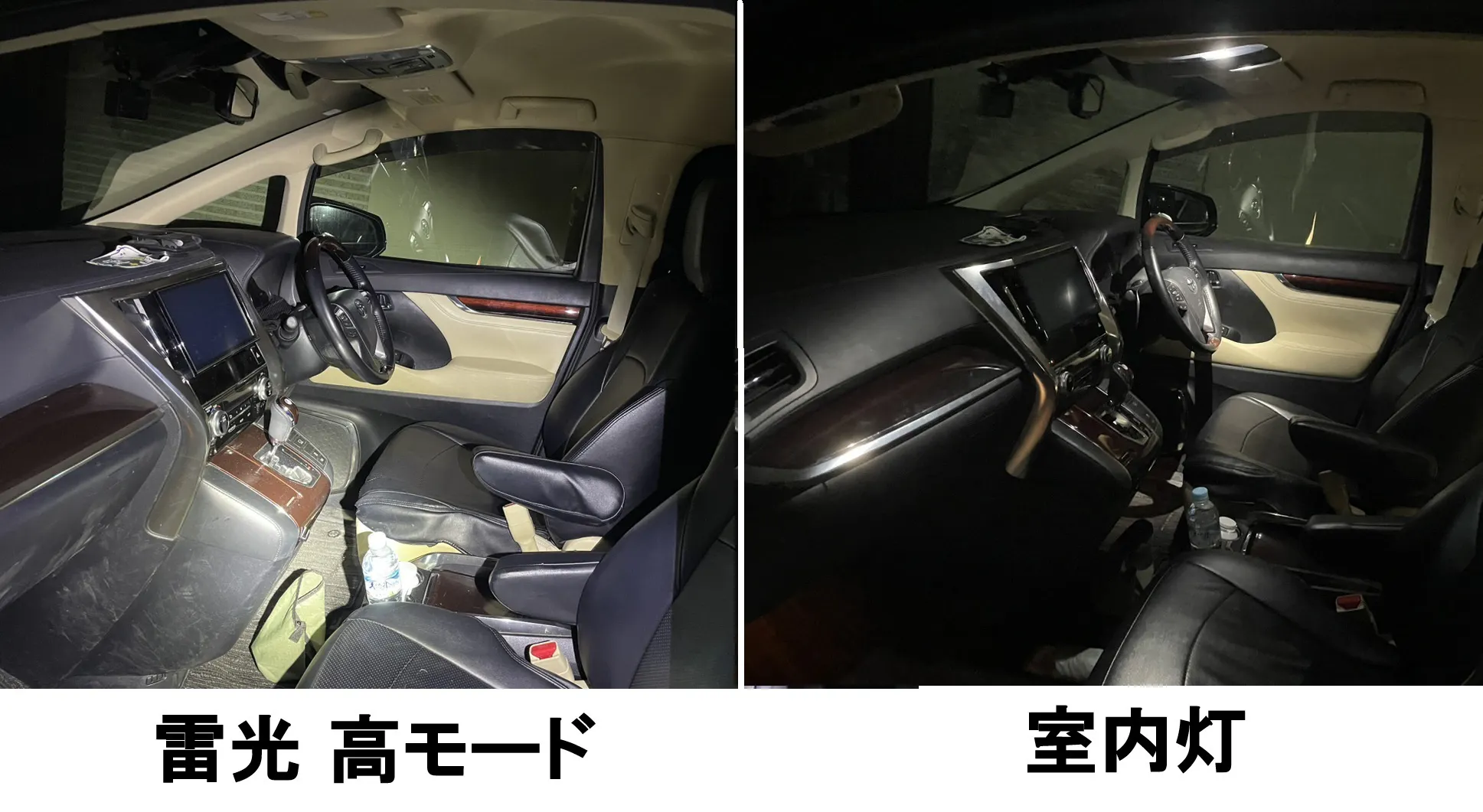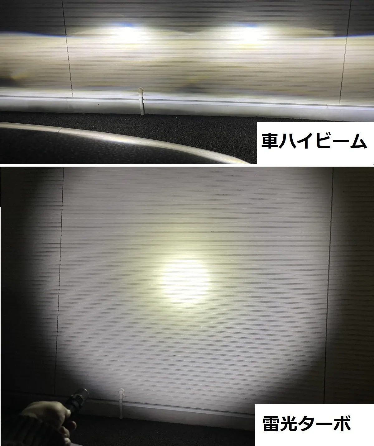 ※車には2つライトが付いてるのに対して雷光一本の照射範囲です。