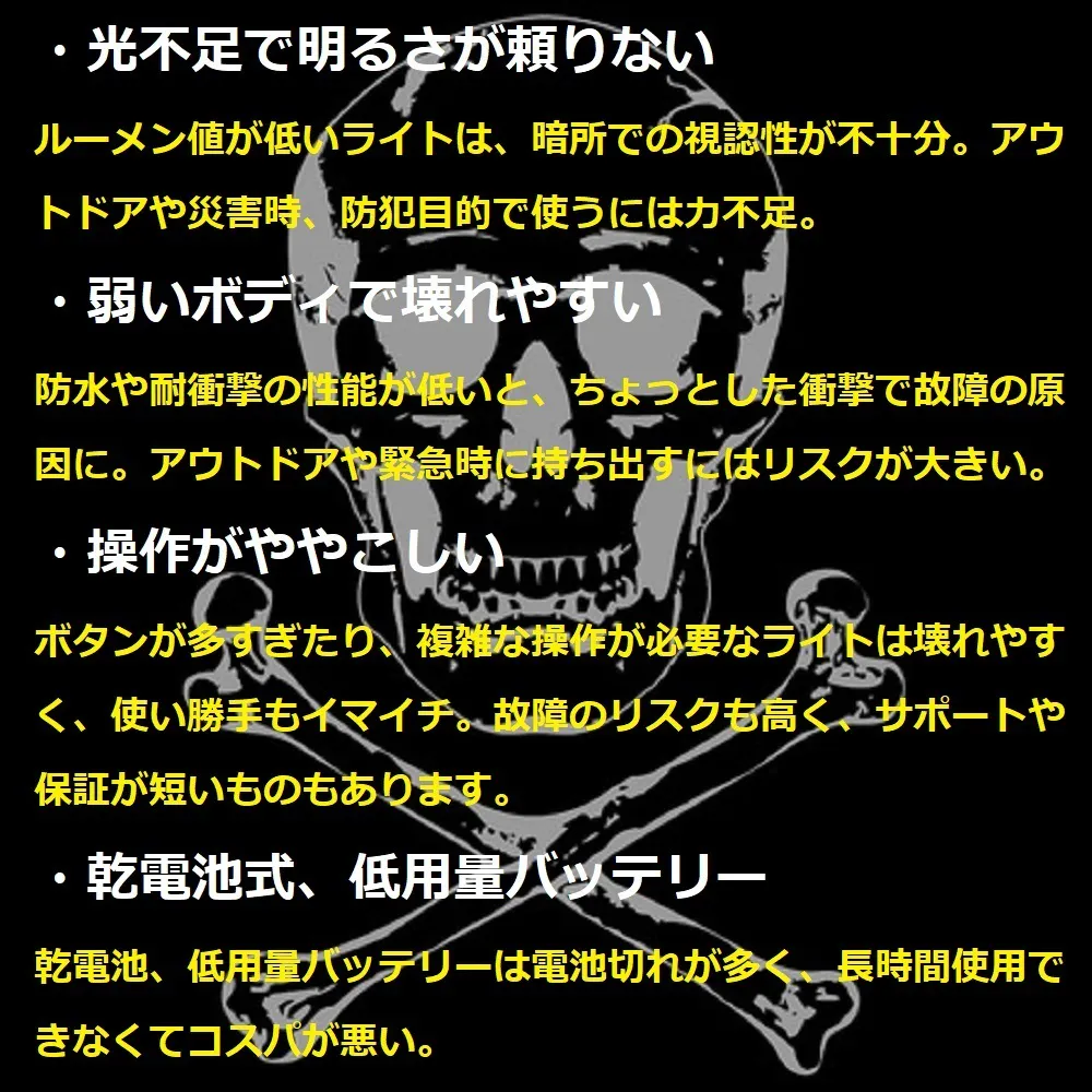 → 遠くから見つけてもらえない(SOSサインや点滅が使えない)