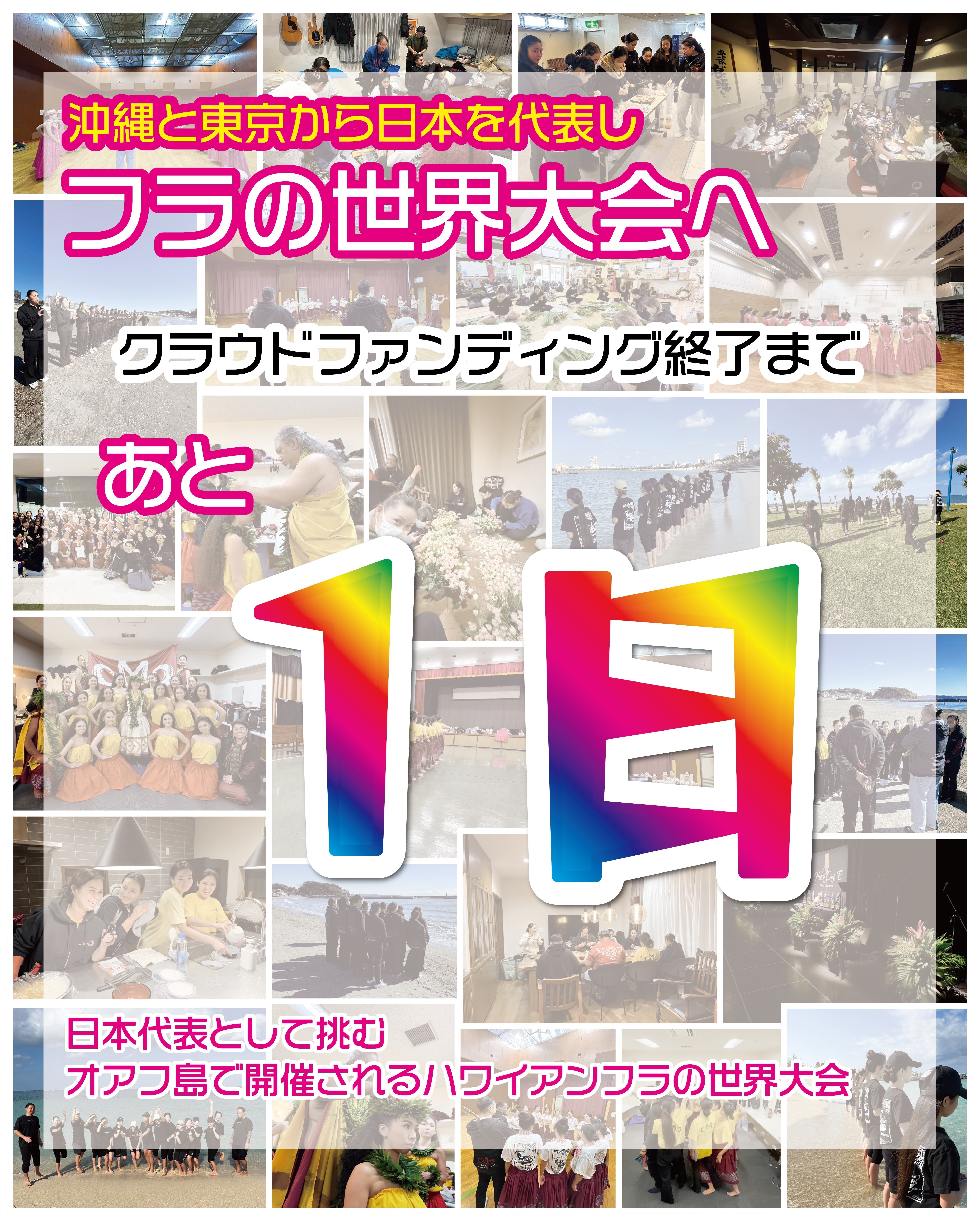 いよいよクラウドファンディング終了まで24時間を切りました!本日の23:59 最後までご支援お待ちしております!!ダンサーの夢への挑戦のため世界の舞台、フラの頂点へのため皆様のご協力、ご支援を心よりお待ちしております!