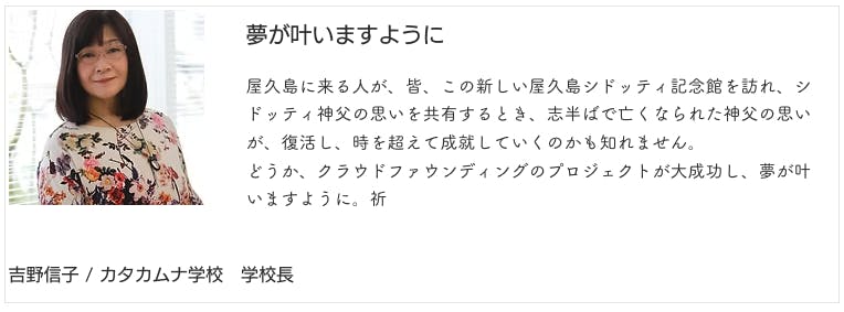 古居智子の知見をもとに、自然だけではない屋久島の歴史・文化を発信する場として「屋久島シドッティ記念館」を上陸地近くに設立する目的で、2022 年 5 月に志を同じくする地域住民が立ち上がり「NPO 法人やくしま未来工房」を設立されました。