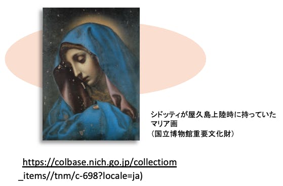 上陸時に持っていた黒い綿袋の中には、1 枚のマリアの聖画が入っていました。衣の中から親指だけが出ているので「親指のマリア」と呼ばれています。3世紀の時を奇跡的に生き延びたこの絵は現在、東京国立博物館の重要文化財となっています。銅板の上に描かれた絵が未だに色褪せないのはなぜか?そして、親指が意味するものは?