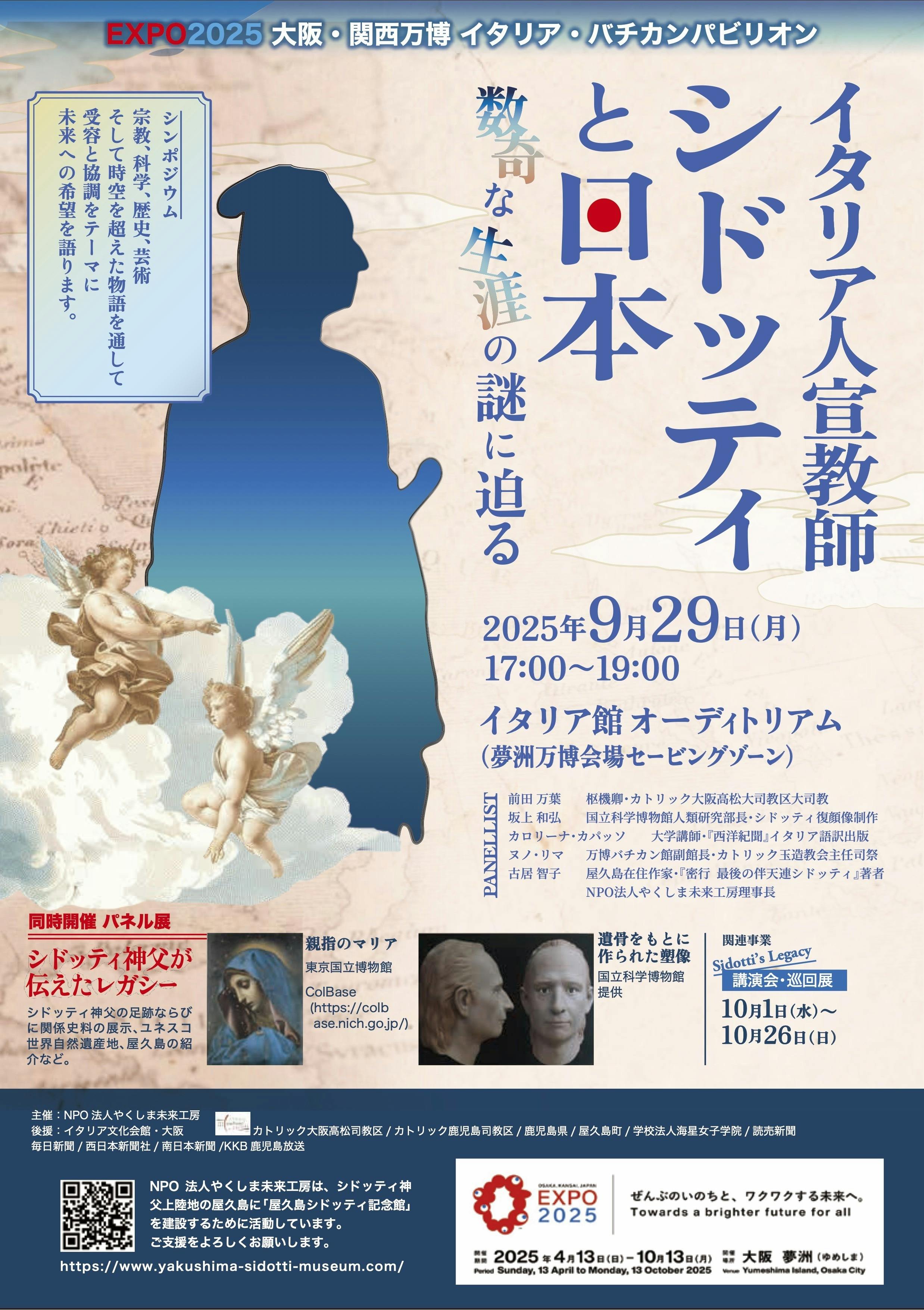 2025 年 9 月 29 日、大阪・関西万博のイタリア館で、317 年前に屋久島に上陸したイタリア人宣教師シドッティの数奇な生涯や交流の軌跡を伝えるパネル展とシンポジウムを開催します。