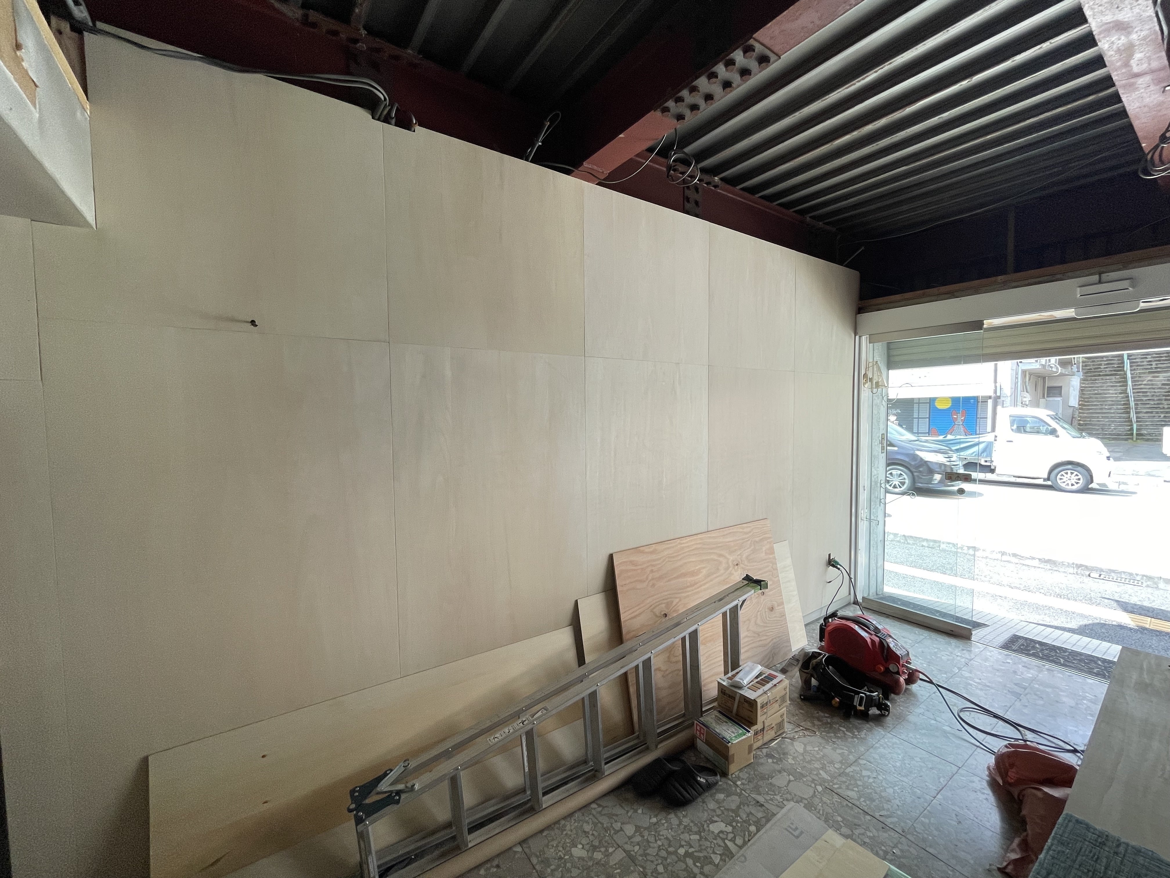 こんな感じで、壁一面にベニヤが貼られた状態です。