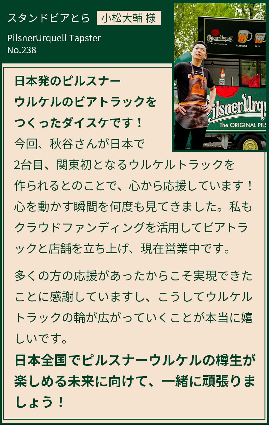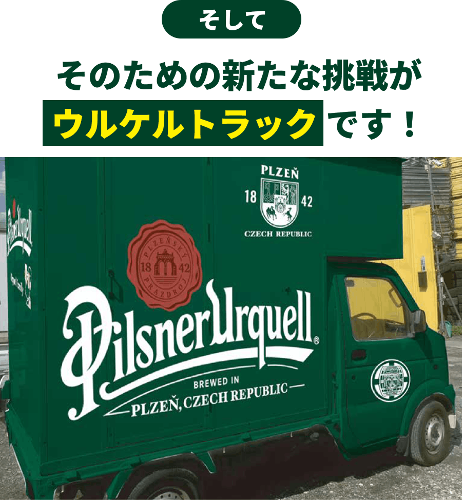 そこで、ウルケルトラックを活用し、ビアフェスやイベントに出店することで、全国のビールファンにピルスナーウルケルの”究極の注ぎ”をお届けしたいと考えています。