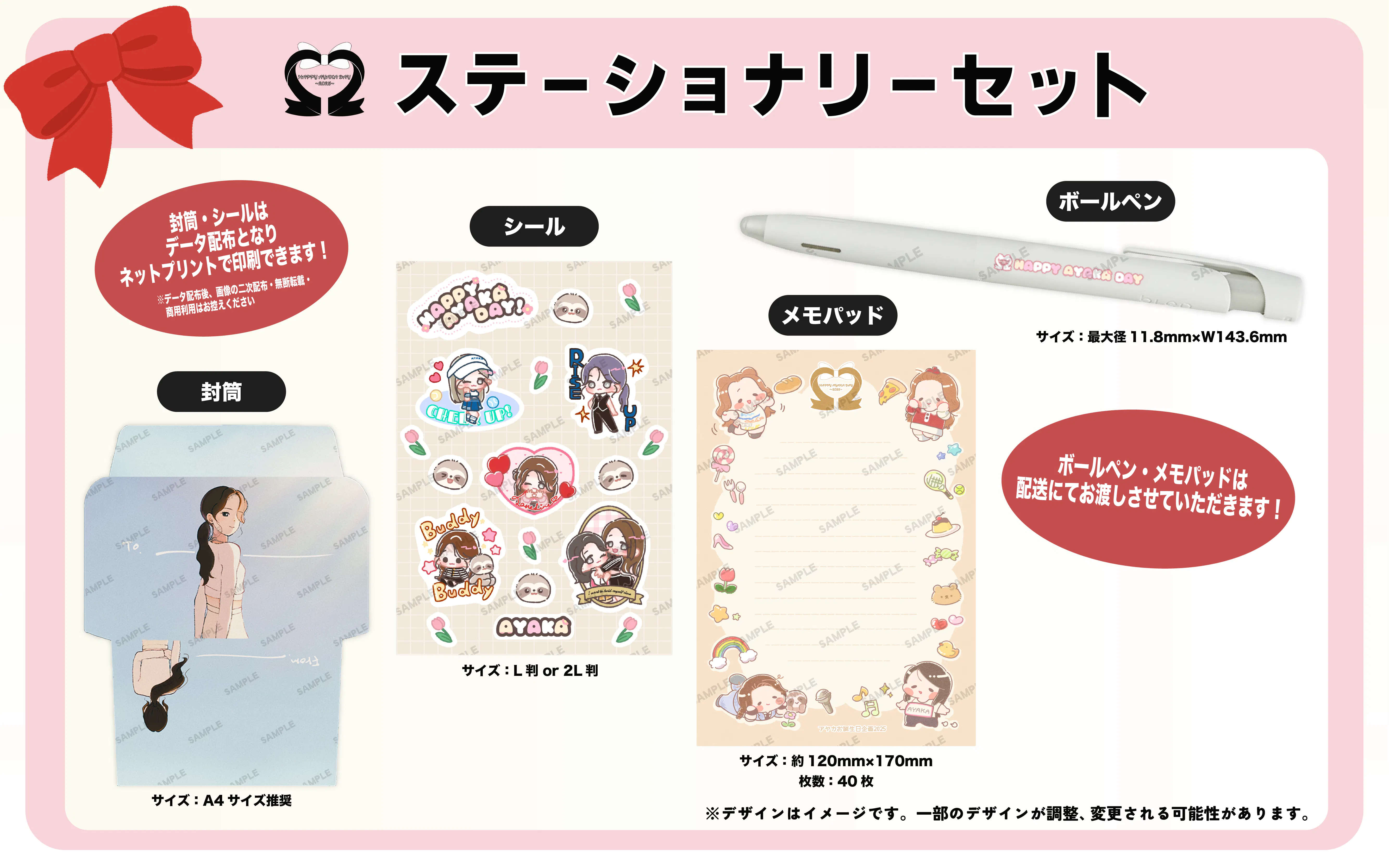 ⑤ステーショナリーセット(ボールペン・メモパッド・封筒・シール) 各1種