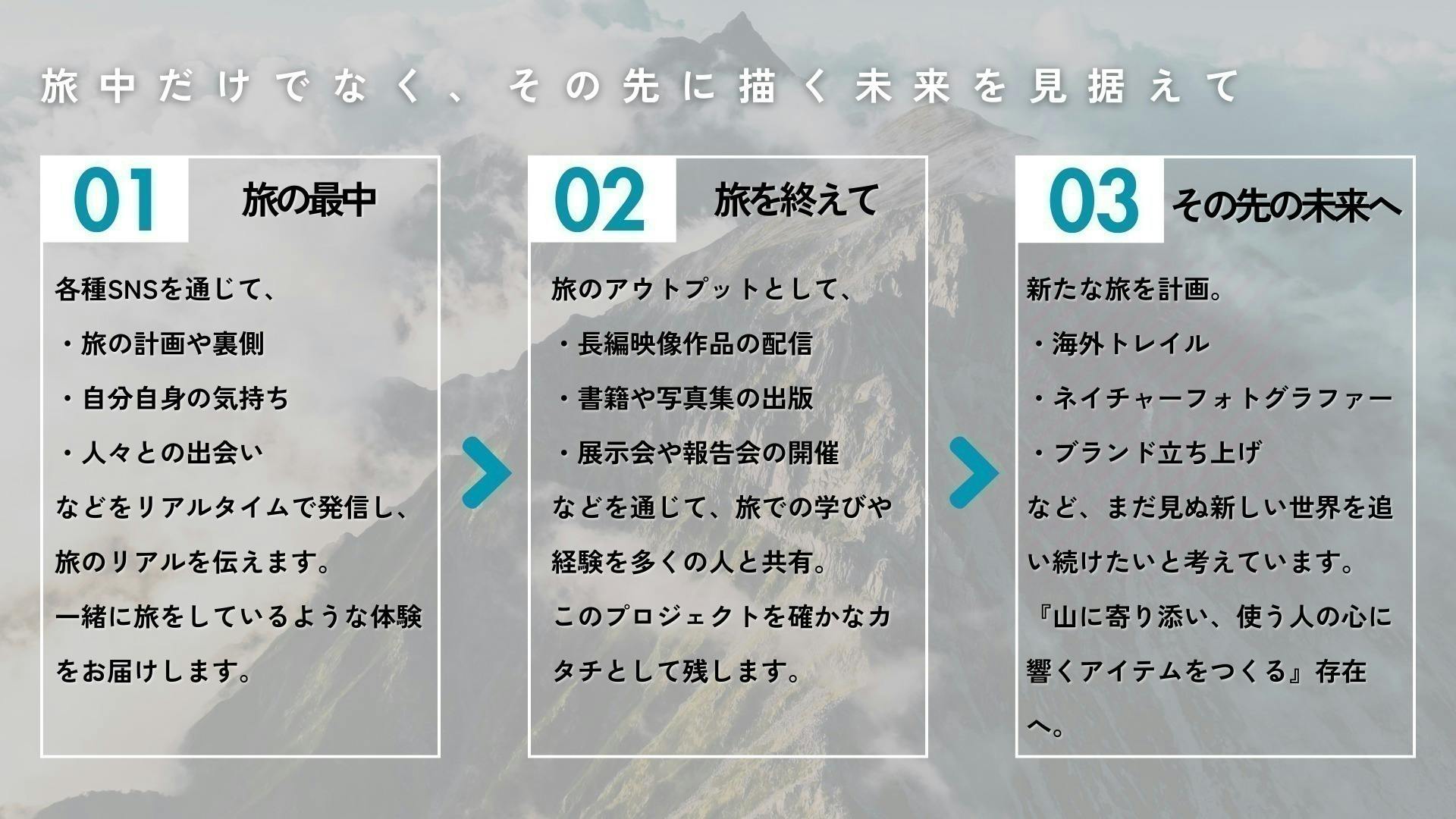 などを通じて、旅で感じたこと・得たものを多くの人と共有します。登山の素晴らしさ、出会い、景色、葛藤。それらを「100 MOUNTAINS , 100 STORIES」としてカタチに残します。