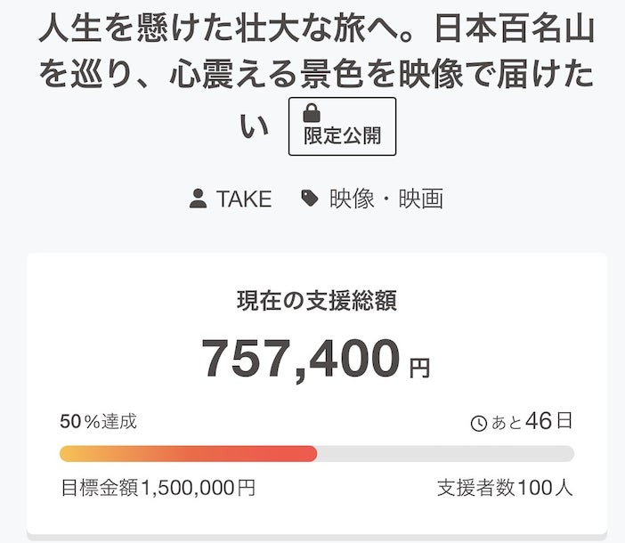 クラウドファンディングもラストスパートに差し掛かり、残すところ1週間となりました!先日、皆様からの多大なる支援のお陰で、目標金額である150万円を達成することができました!!支援していただいた皆様には、深く感謝申し上げます。今回のプロジェクトの中でも、クラウドファンディングを成功させるというのは1つの目標としていましたので、それが何とか達成できて嬉しく思います!Instagramでの情報発信は日頃していましたが、YouTubeで見ていただいている方には思うように情報を届けられず、申し訳ありませんでした。しかし、それにも関わらず最後は怒涛の巻き返しでたくさんの方から支援をしていただき、達成することができました。しかし、終了まで残り1週間あります!!ここでしか申し込めないリターンや、お得な最終キャンペーンもありますので、ぜひこの機会をお見逃しないよう、引き続き支援のほどよろしくお願いいたします!!商品を購入していただいた皆さんには順次発送の準備を進めていきますので、商品到着までお待ち下さい。引き続き、100MOUNTAINS,100STORIES.への応援よろしくお願いいたします!