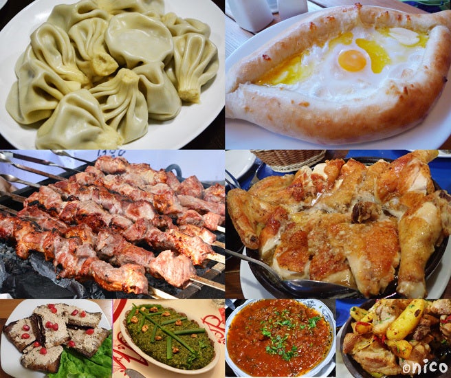 コーカサス山脈の栄養豊富なミネラルウォーターと肥沃な大地から作り出される食材は、驚くほど新鮮で大変美味。ジョージア料理はオーガニックな野菜や肉にスパイスやハーブ、ヘーゼルナッツやクルミなどのナッツ類、多種多様なチーズ、ザクロなどを使ったものが多いです。そして、これらの食材をバランスよく摂取する食習慣と独特の調理法が長寿の秘訣と言われています。ジョージア各地方で古来の伝統料理が数多く存在する一方で、トルコ料理やイラン料理など近隣諸国の影響を受けた料理もあり、非常に豊かで多彩な食文化を作り出しています。国民食として人気がある、水餃子や小籠包を彷彿させる「ヒンカリ」や、溶けたチーズが中に入ったジョージア風ピザパン「ハチャプリ」など、日本人の口にもとても合い、食べた人の胃袋を鷲掴みにします。その中でも、特に人気の高い料理をいくつかご紹介します。