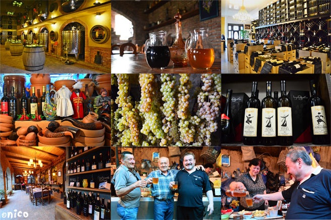 ワインはジョージアの象徴であり、人々にとっても日常と強く結びついたものです。街を歩くとお土産屋やレストラン、バザール、酒屋と、お店に並んだたくさんの種類のワインが目に飛び込んできます。丸々したジョージア(グルジア)語でデザインされたラベルを眺めるだけでもワクワクします。素敵なボトルワインを買うのもいいですが、ペットボトル入りの量り売りワインや、立ち飲み屋で一杯試すのも乙なものです。昼間から「飲んでいきなよ」と声がかかることも日常茶飯事。そんな時は輪に加わり、コミュニケーションをとるのがジョージア流のワインの楽しみ方のひとつです。