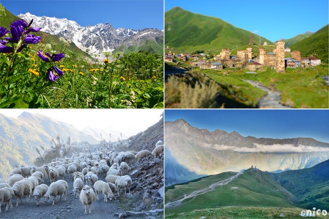 ジョージアは豊かな自然に囲まれており、日本と同様に四季があります。6月から9月にかけてはハイキングやトレッキングのベストシーズンです。たくさんの国立公園やトレッキングコースがありますが、最も人気があるのはコーカサス山脈の高峰群に囲まれたゼモ・スヴァネティ地方のメスティア周辺と、ムティアネティ地方のカズベギ周辺です。見晴らしの良い場所に建つグルジア正教会や「復讐の塔」と呼ばれる塔に立ち寄り、咲き乱れる多種多様な花を愛でながらのトレッキングは格別です。またトレッキングだけでなく、夏は黒海の港町バトゥミのビーチで海水浴、秋はラチャのシャオリ湖で紅葉観賞を、冬はグダウリ、バクリアニ、メスティアなどでスキーを楽しむこともできます。リゾートにも力を入れており、温泉施設があり炭酸水を産する緑豊かなボルジョミやツハルトゥボ、サイルメなどが有名です。一年中さまざまなアクティビティを通して、自然を心ゆくまで楽しむことができます。