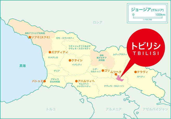ジョージアは「コーカサス」と呼ばれる黒海とカスピ海に挟まれた地域にある国で、北は大コーカサス(カフカス)山脈を挟んでロシアと接し、東はアゼルバイジャン、南はアルメニアおよびトルコと国境を接し、西は黒海に面しています。自然豊かで山がちな土地であるものの、国土の大半は温暖な気候で四季の変化にも富んでいます。新鮮な素材を活かした食文化が豊かで、独自製法によるワインの生産も非常に盛んです。特にワインに関しては8,000年以上の歴史を誇ります。