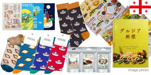 お洒落なポストカードやジョージア料理に欠かせないスパイスやレシピ本、お土産に大人気のヒンカリ&ハチャプリ靴下など、日本では入手しにくい品物をご用意いたしました。品物と一緒に、日本から離れたジョージアの風も感じてもらえるとうれしいです。