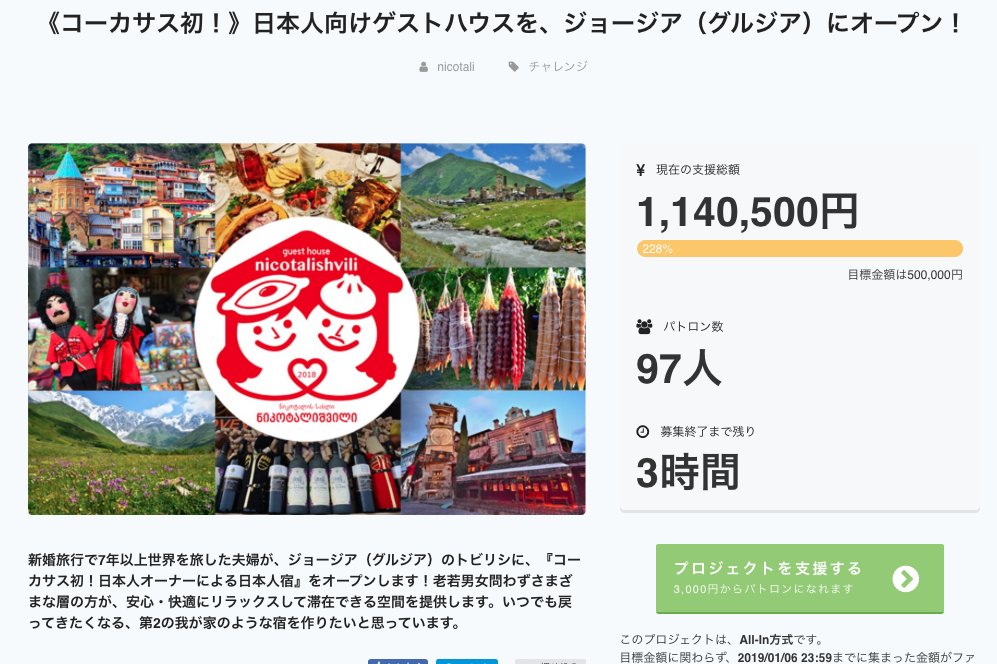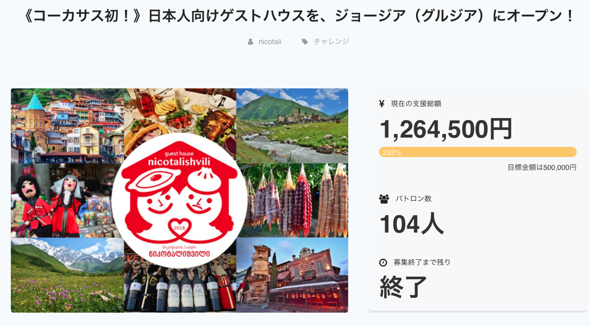 最後までお読みいただき、本当にどうもありがとうございます!私たちの気持ちが伝わるだけでもうれしいです。「この場でご支援してくださる」「お友達やお知り合いに紹介してくださる」など、ご覧いただいた方それぞれの方法でご協力くださるとうれしいです。皆さまと一緒に作り上げる、ゲストハウス「nicotalishvili」への応援、よろしくお願いいたします。☺応援団も募集中です☺