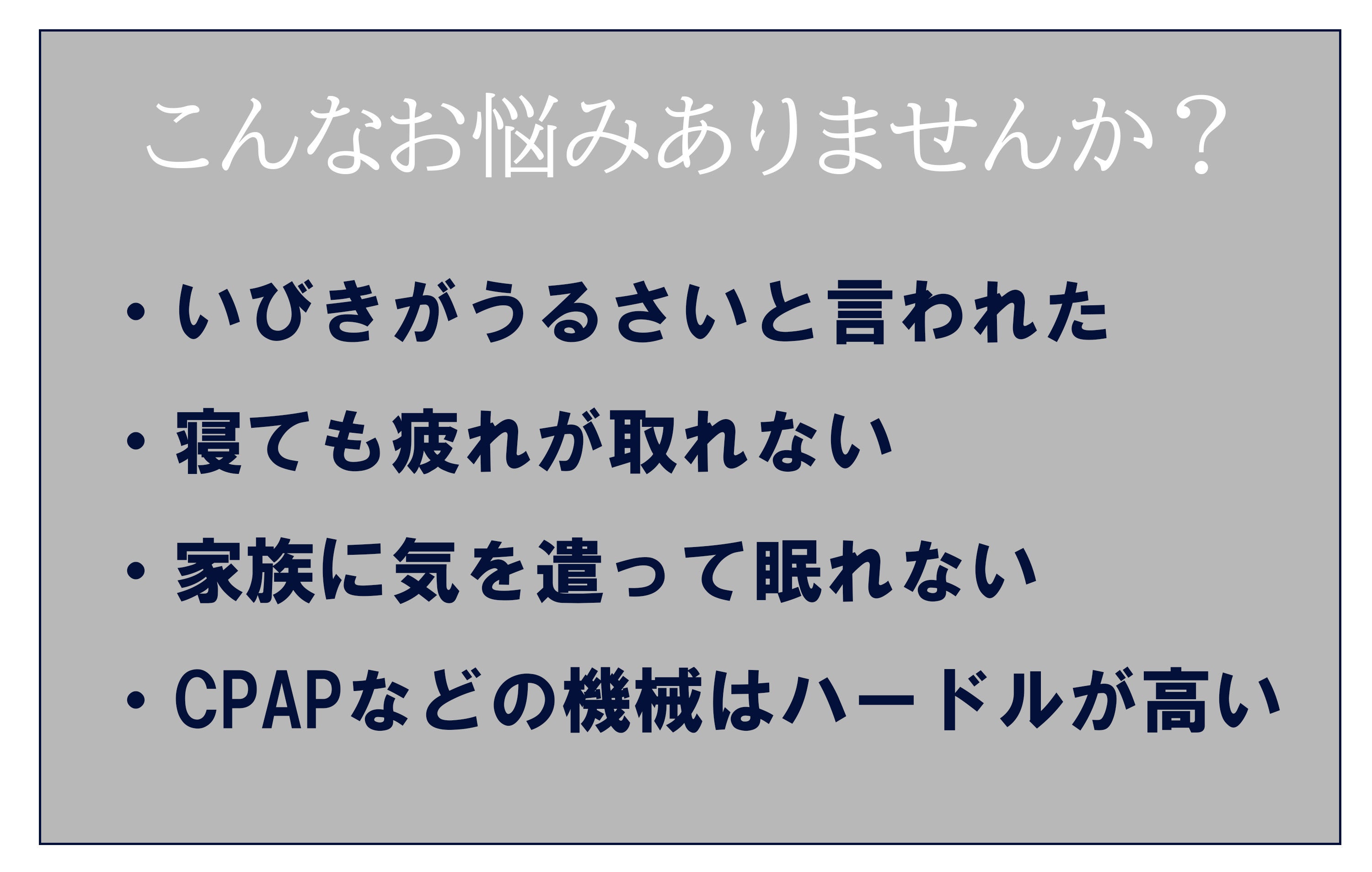 呼吸が浅くなることで、睡眠の質は大きく低下し、翌日の疲労感や集中力の低下、さらには慢性的な健康リスクにもつながります。「ちゃんと寝ているはずなのに疲れが抜けない」「日中ボーっとする」「仕事中に眠気が襲ってくる」といったお悩みがある方は、いびきが関係している可能性があります。