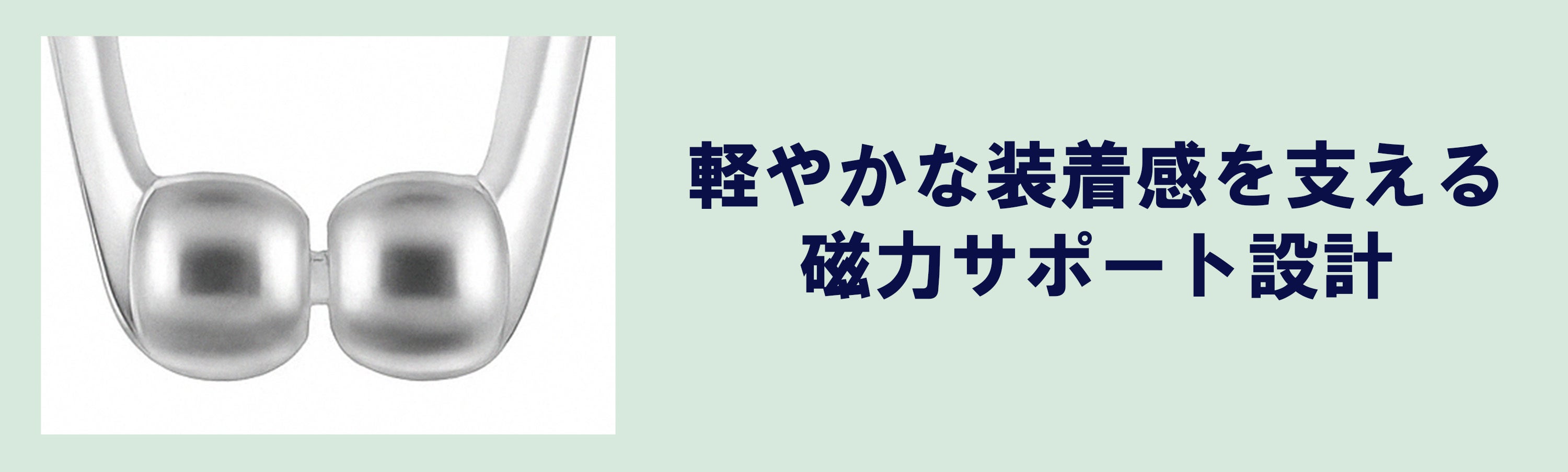 内蔵された磁石が、鼻腔の左右をバランスよく支え、自然な鼻呼吸を促します。磁力により軽くフィットすることで、圧迫感を与えず、無理のない装着が可能に。寝ている間のズレや違和感を最小限に抑える構造です。